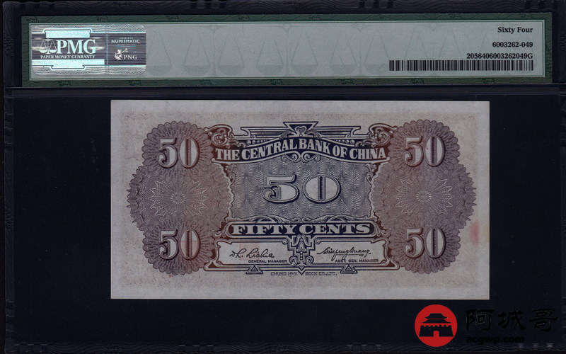 Lot:31 中央银行 中华书局版 紫色伍角 长号 PMG 64