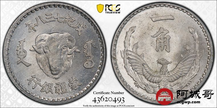 Lot:19 1943年 成纪七三八蒙疆银行壹角 PCGS MS64