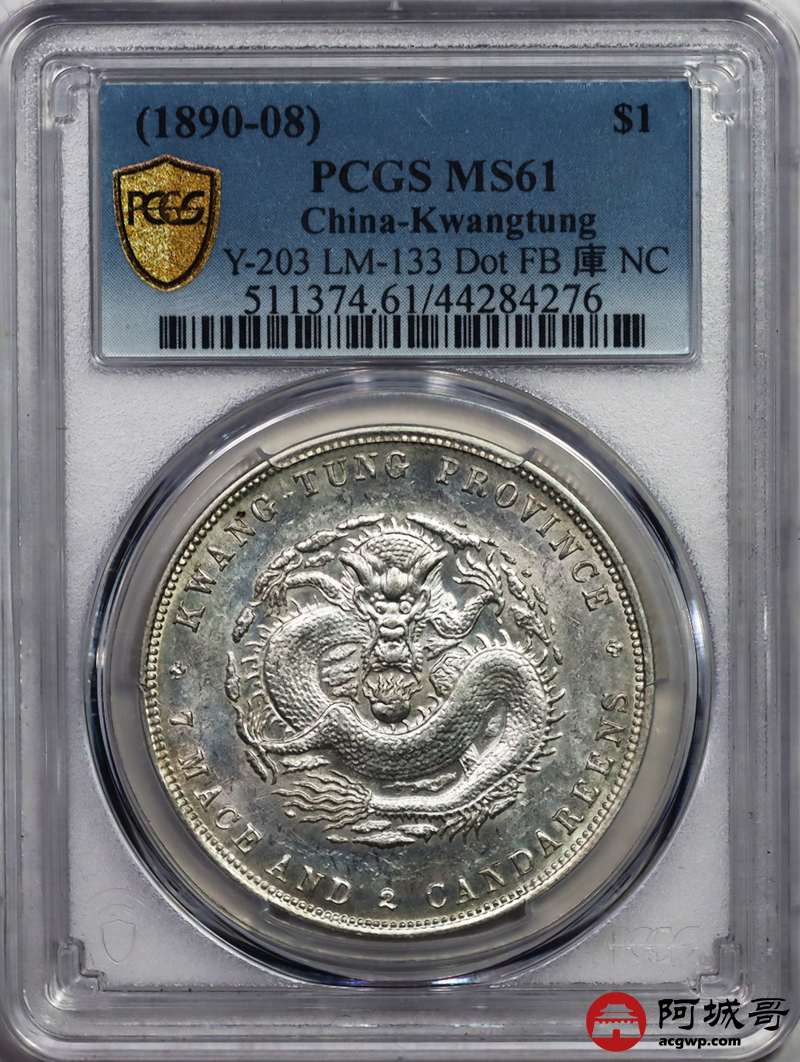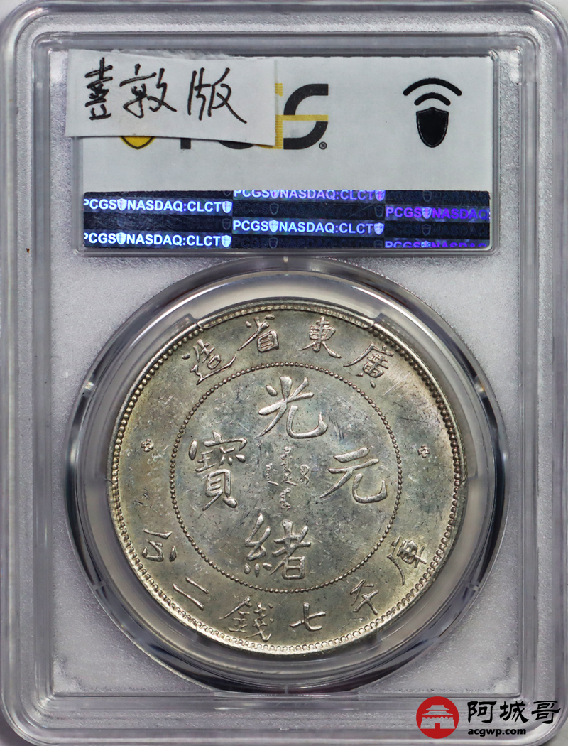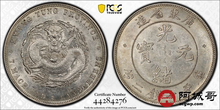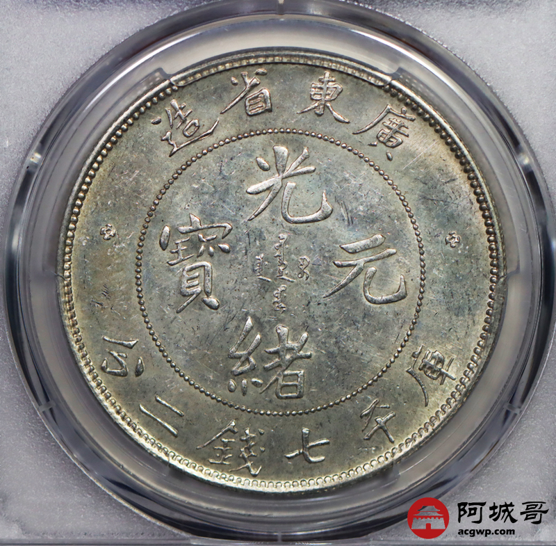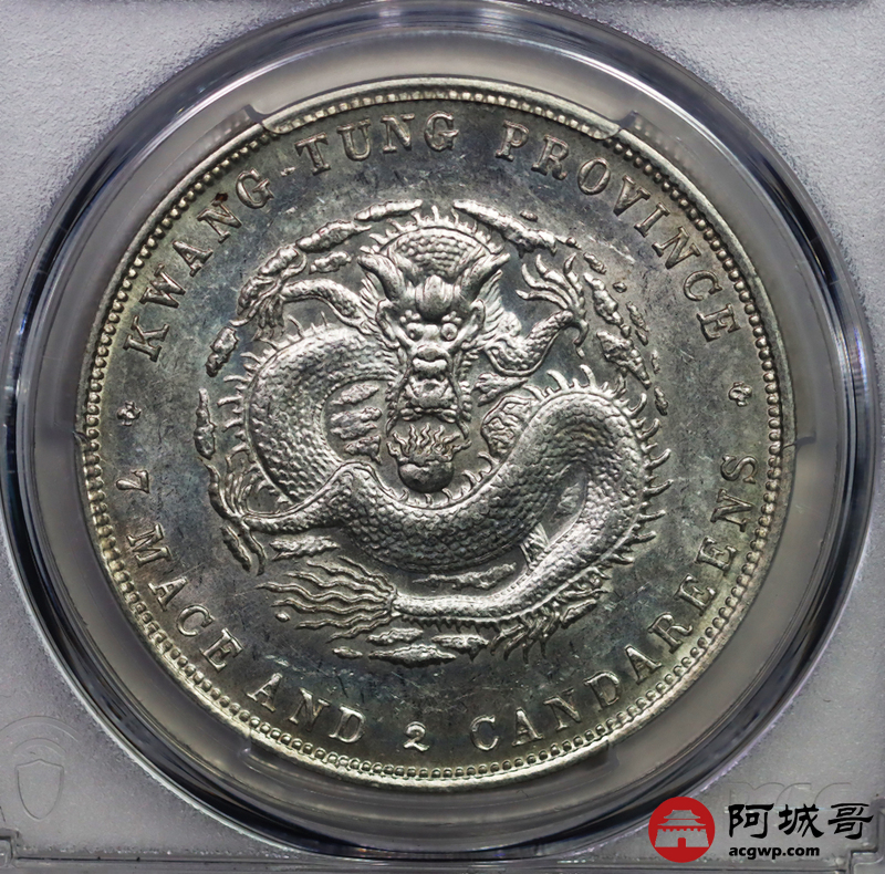 Lot:15 原味 转光 淡彩 广东光绪 龙洋 七钱二分 喜顿版 PCGS MS 61