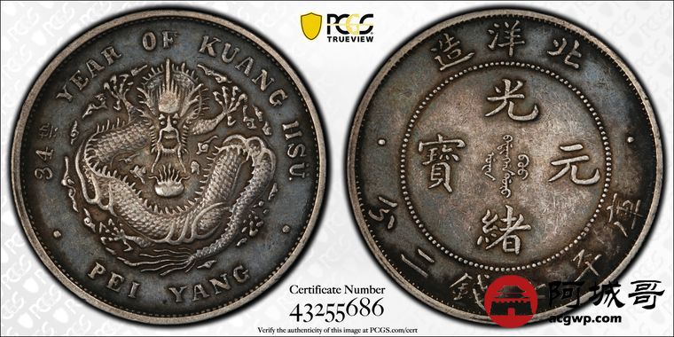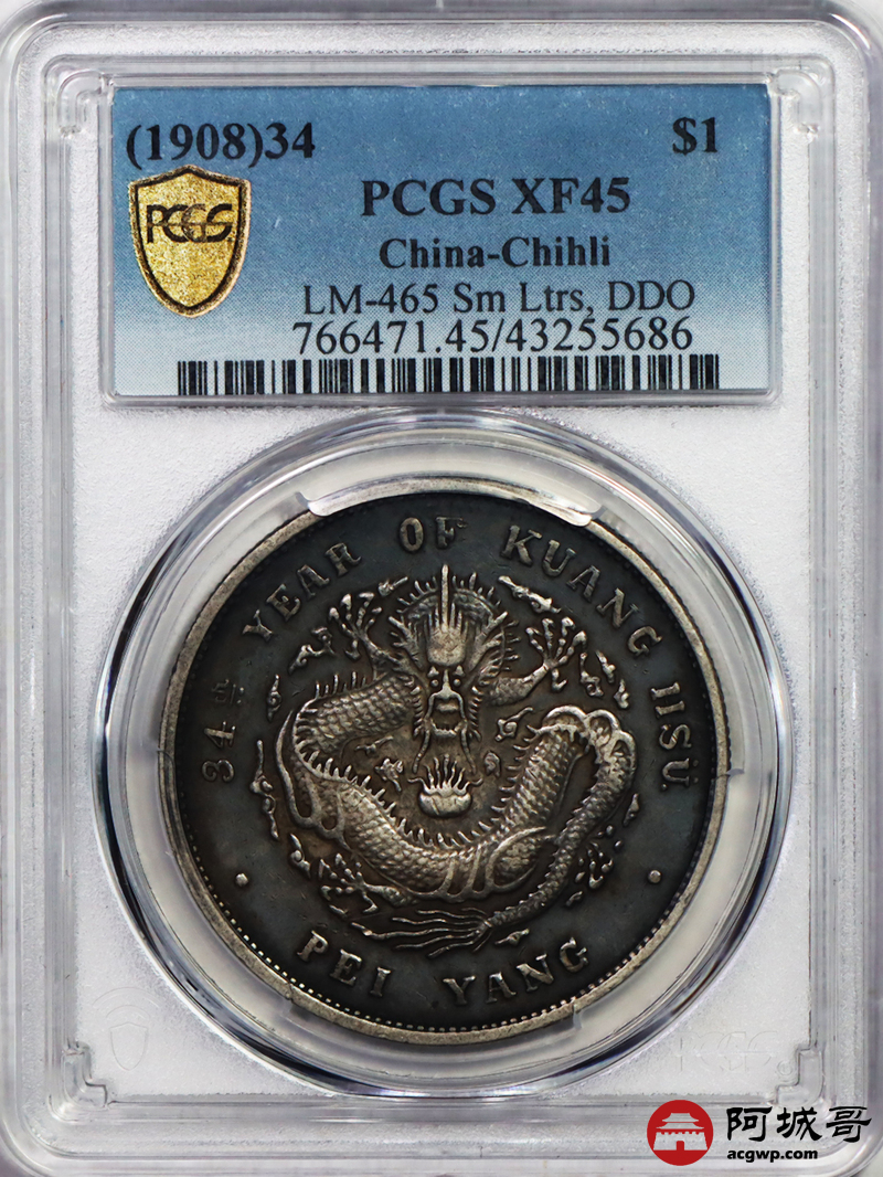 Lot:8 原味 老包浆 北洋 34年龙洋 七钱二分 小字 PCGS XF 45
