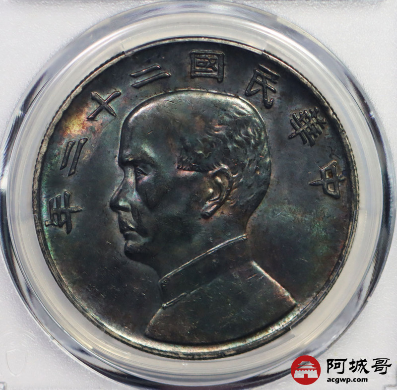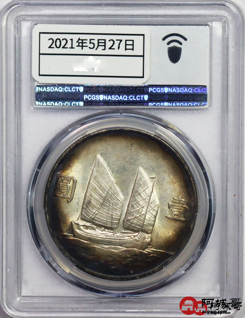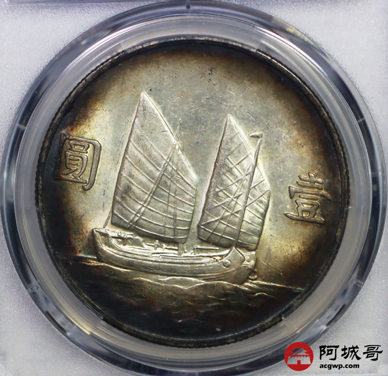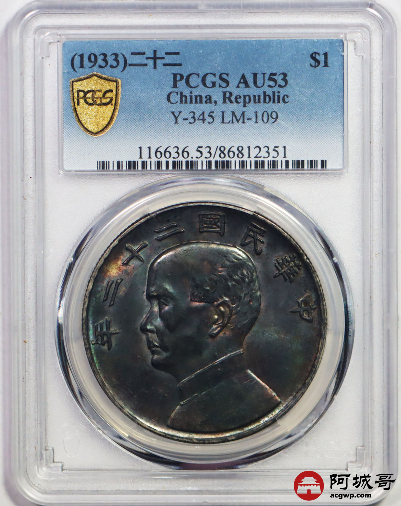Lot:4 c原味黑五彩光 民国22年船洋 壹元 PCGS AU 53