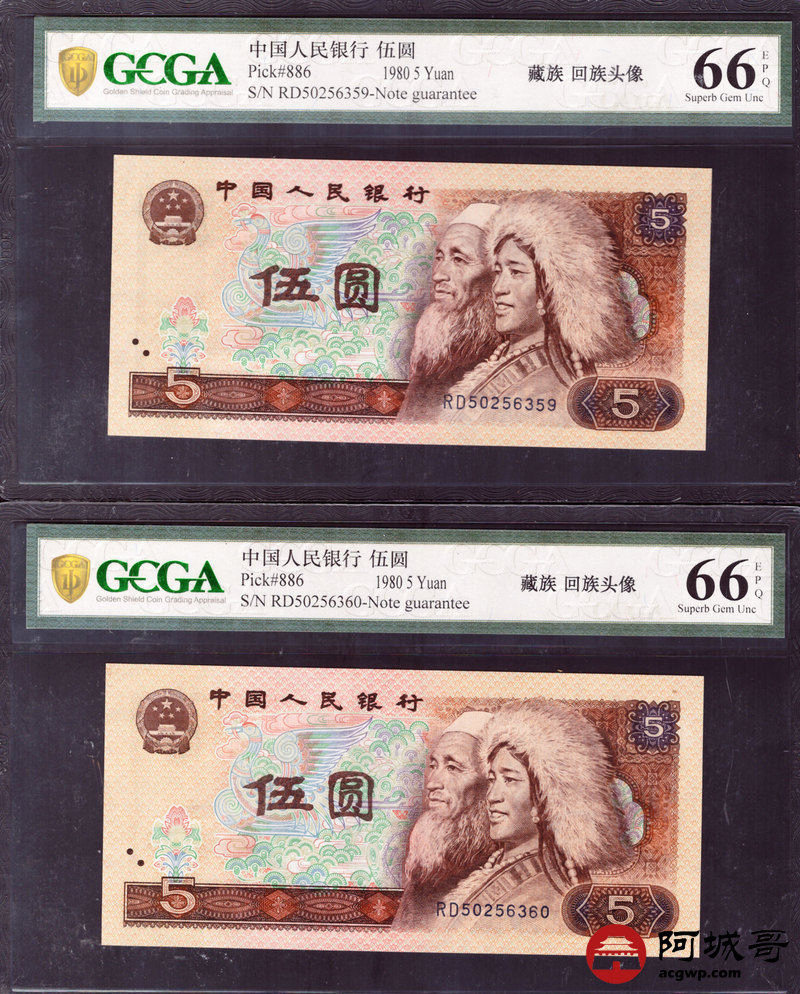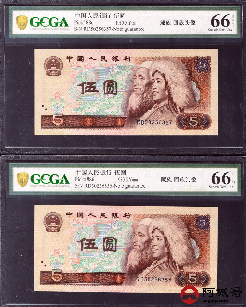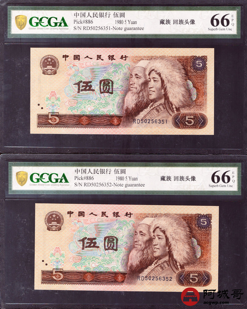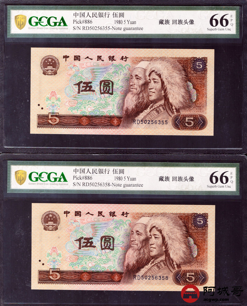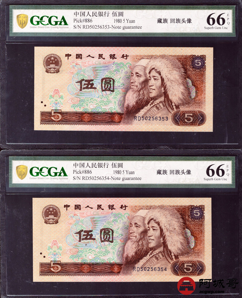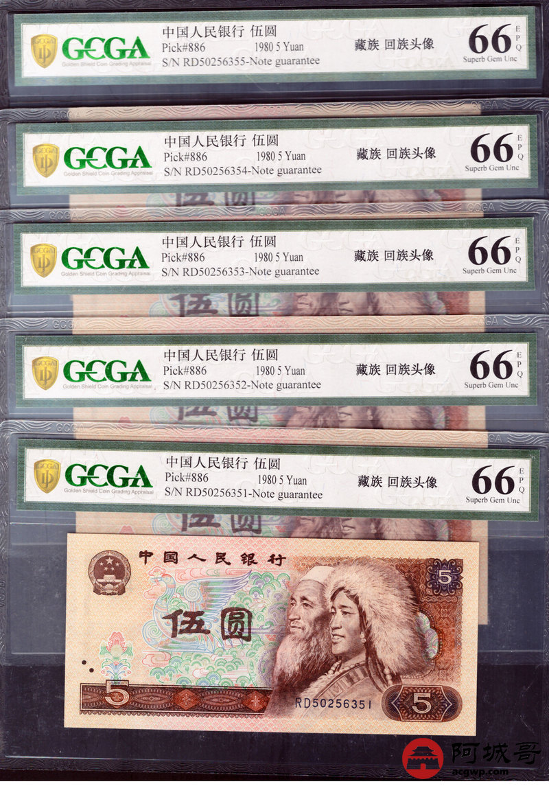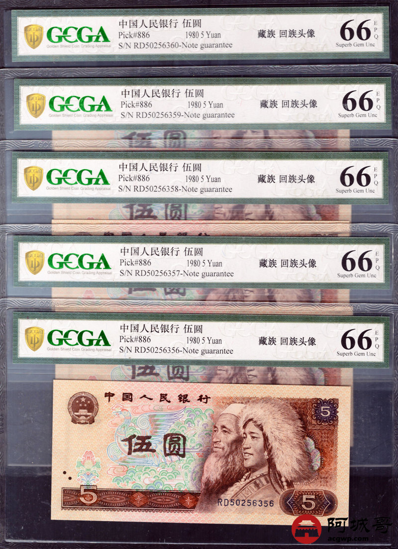 Lot:17 四版 1980年伍圆 GCGA 66EPQ 十枚连号一组 好号无47