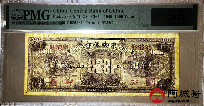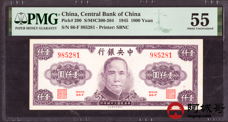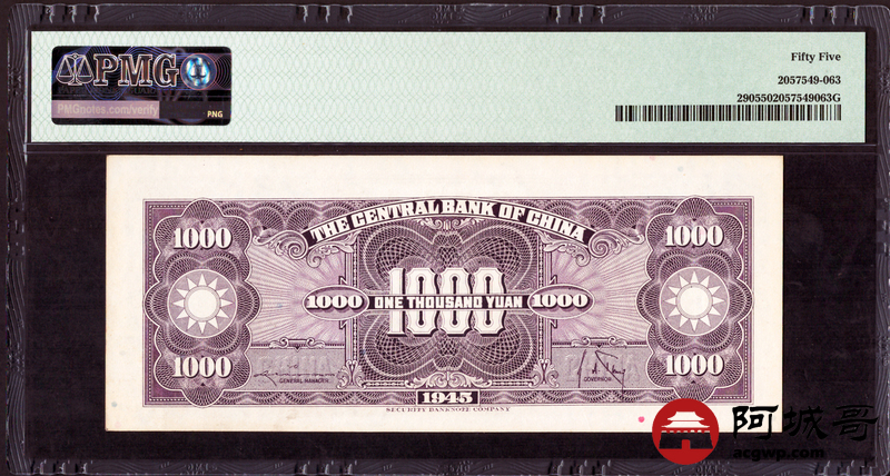 Lot:2 民国34年 壹仟圆 中央银行 PMG 55