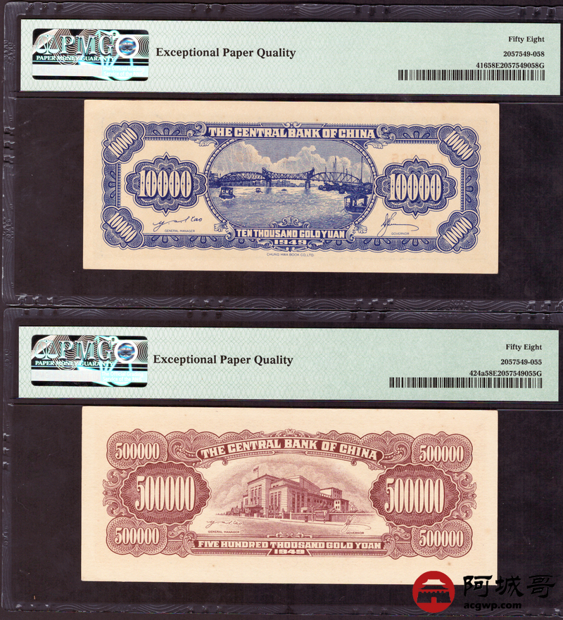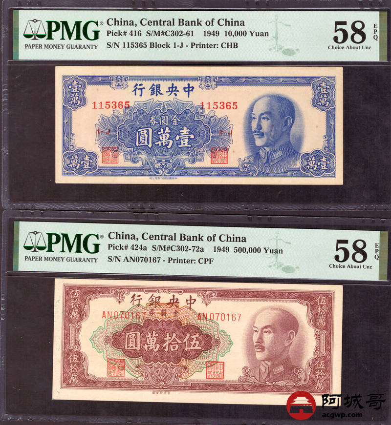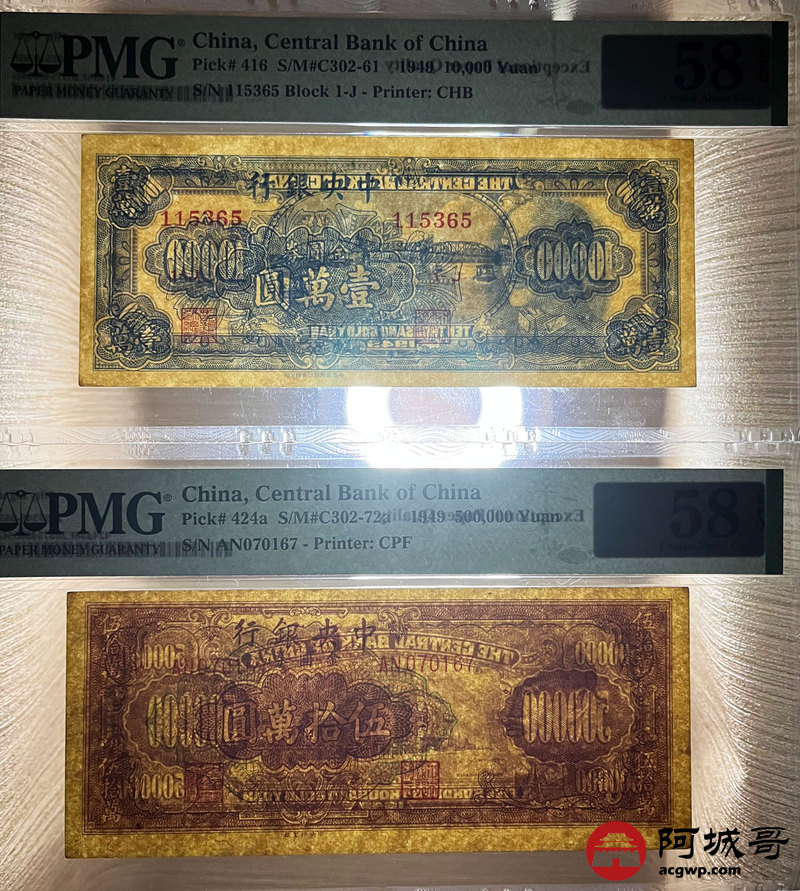 Lot:19 1949年 中央银行 金圆券伍拾萬圆、壹萬圆 PMG 58EPQ 2张