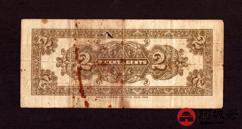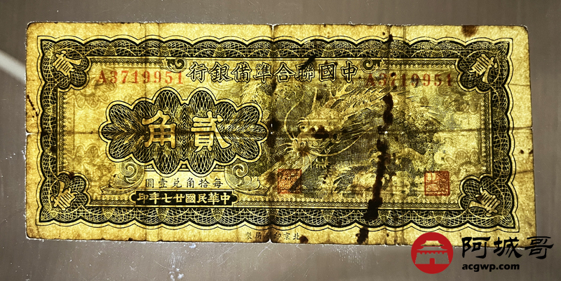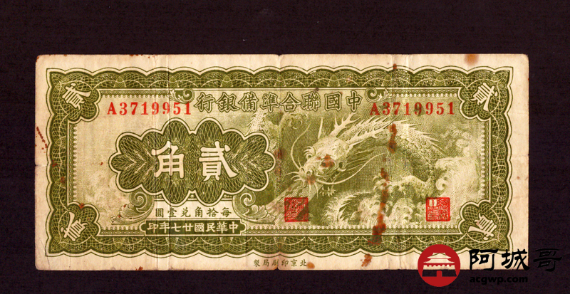 Lot:6 中国联合准备银行 小龙贰角 民国27年 76成新