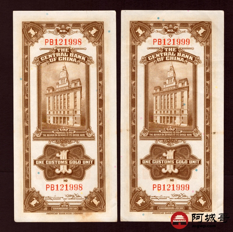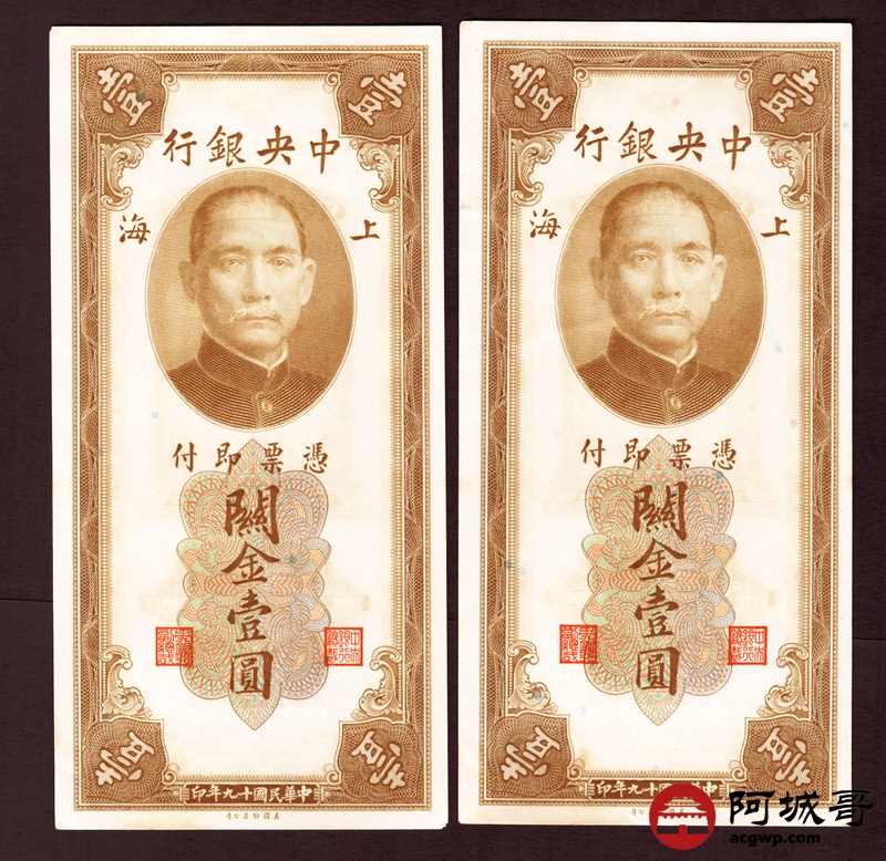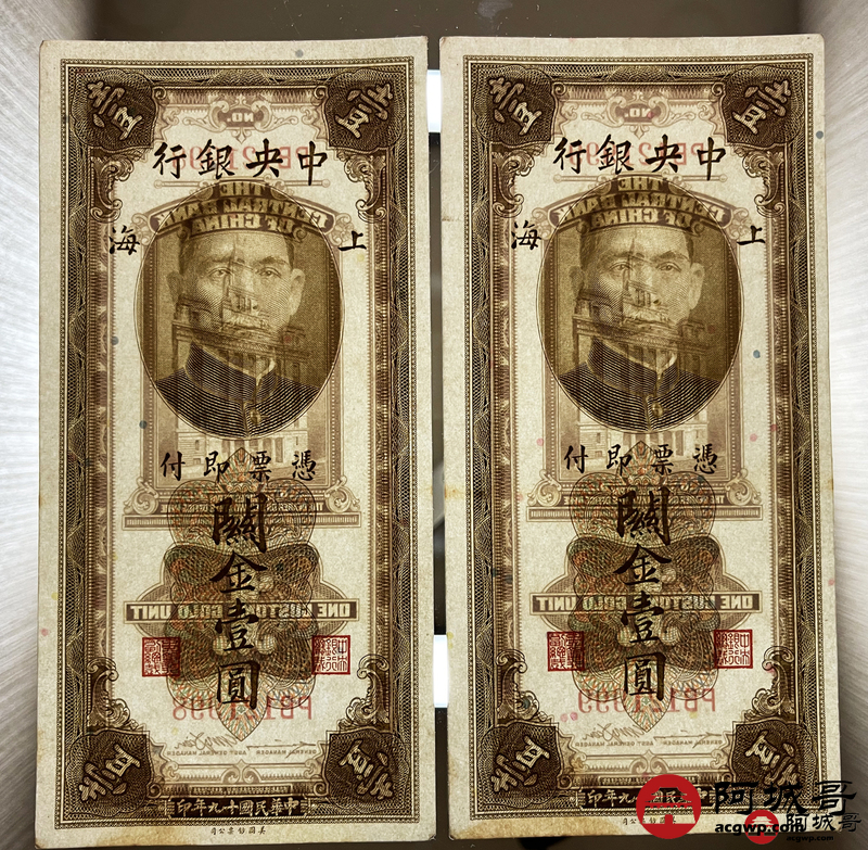 Lot:9 中央银行 关金壹圆 民国19年 原票 94成新 微有折痕 尾号998 、尾豹子号999