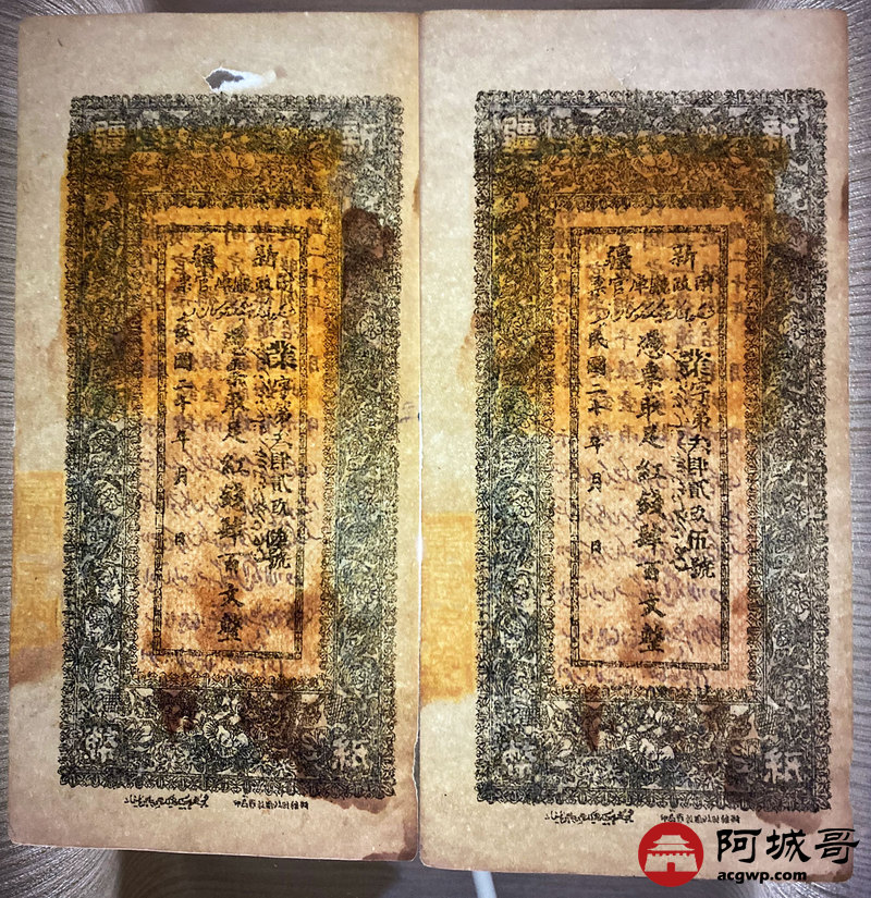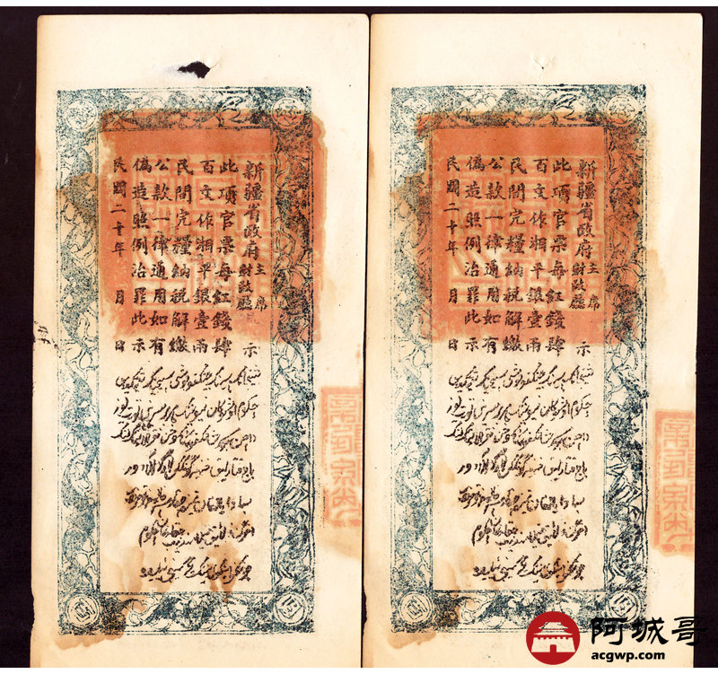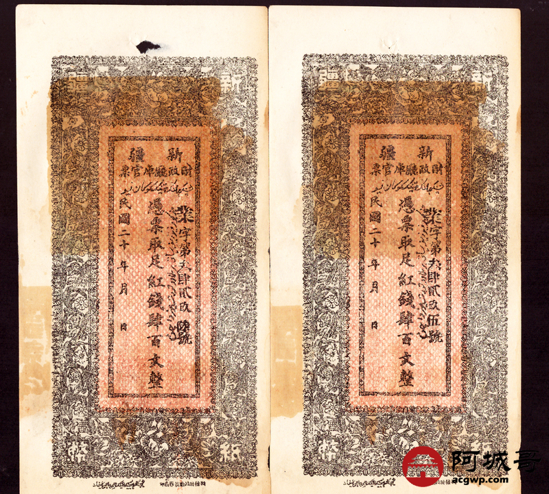 Lot:11 民国20年 新疆 财政厅库官票 红钱肆佰文 95至97成新 好品少见 两张