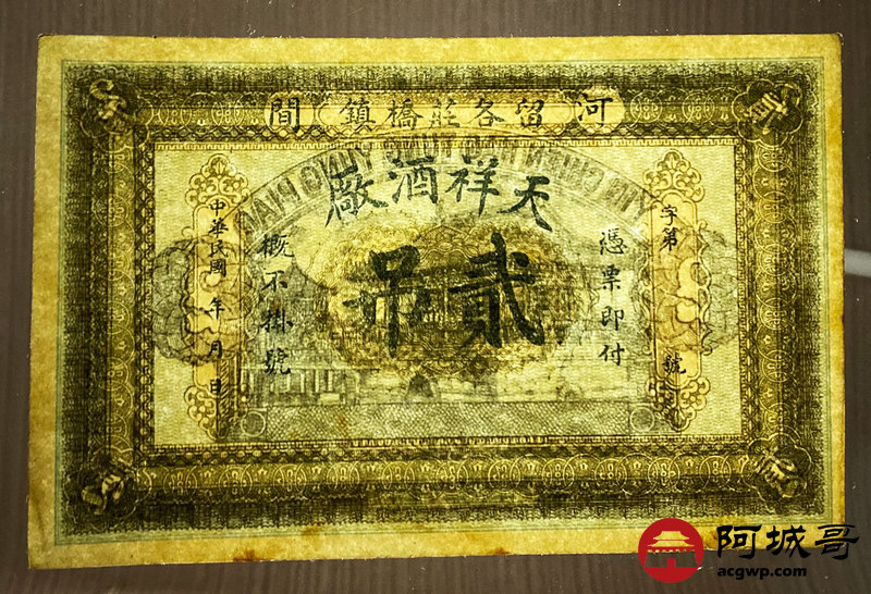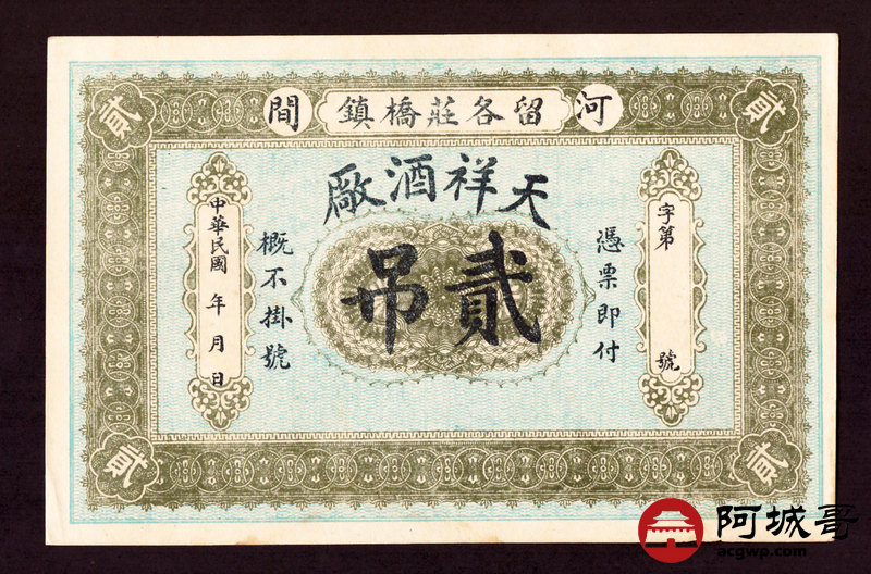 Lot:1 河间 天祥酒厂 贰吊 未流通票 9至92成新
