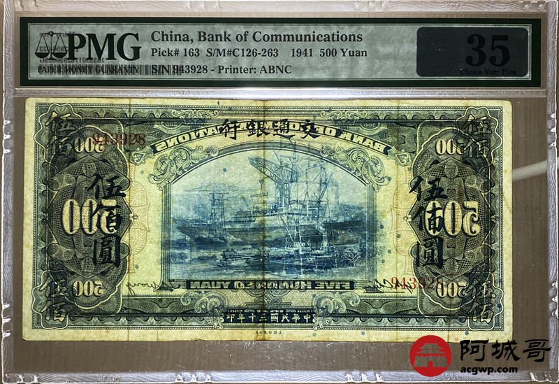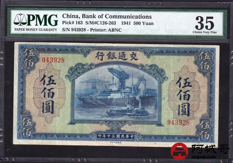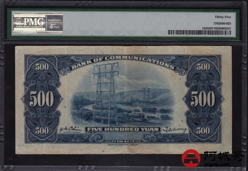 Lot:20 中华民国三十年 伍佰圆 交通银行 美钞版 PMG 35 名誉品 少见