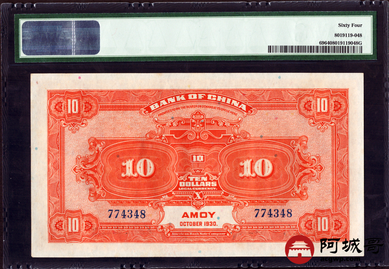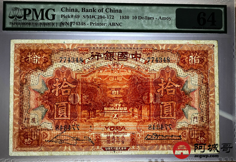 Lot:4 民国19年 中国银行拾圆 厦门地名 PMG64