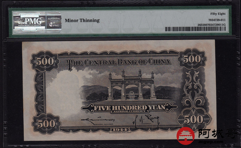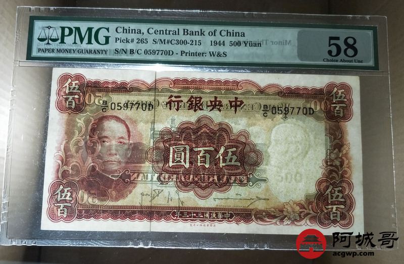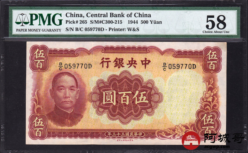 Lot:5 中华民国三十三年 伍佰圆 中央银行 PMG 58