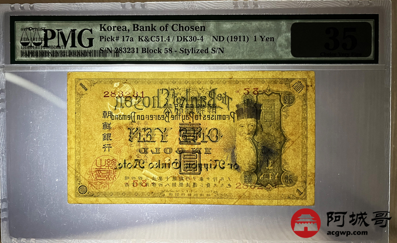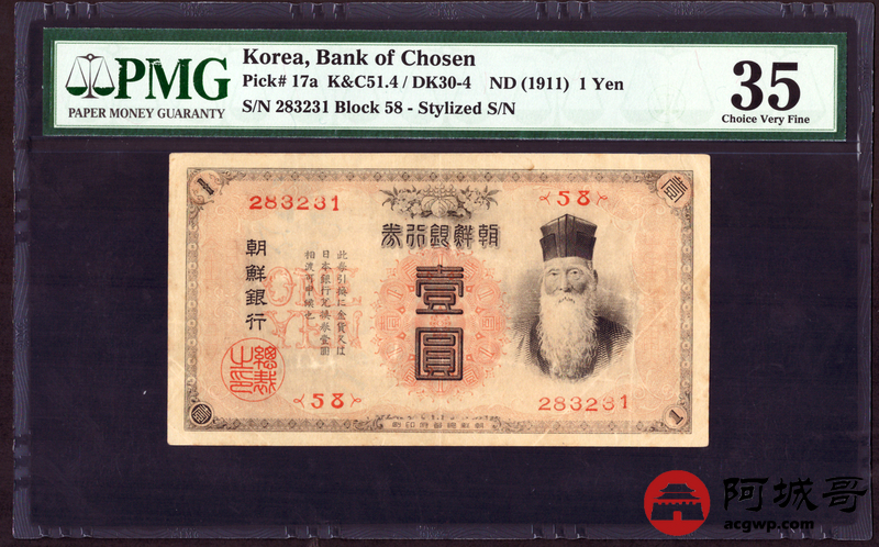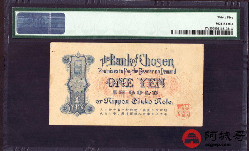 Lot:10 1911年 壹圆 朝鲜银行 PMG 35