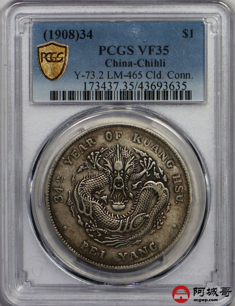Lot:27 原味 清包浆 北洋34年龙洋 七钱二分 PCGS VF 35