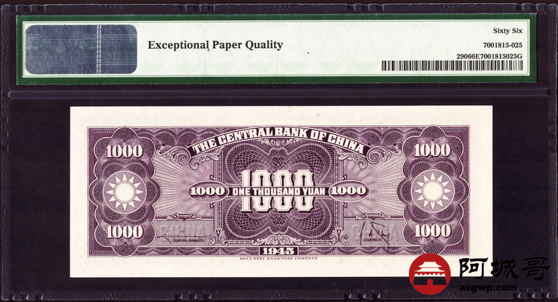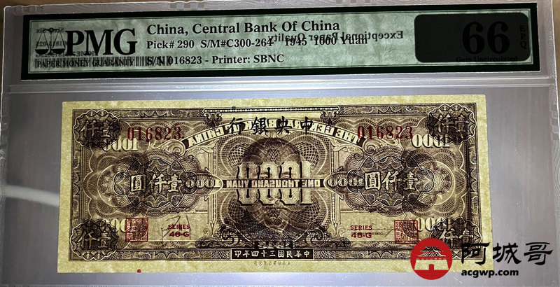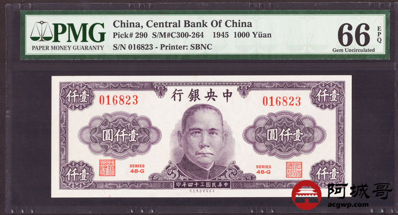 Lot:18 民国34年 壹仟圆 中央银行 PMG 66 EPQ 好号无47