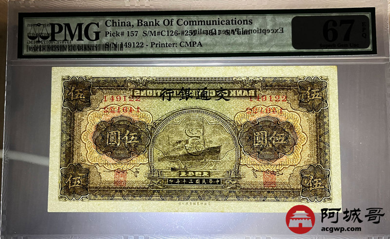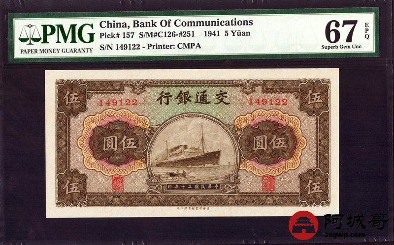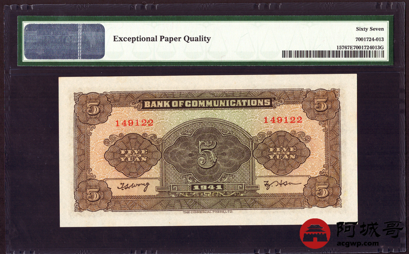 Lot:10 民国30年 伍圆 交通银行 PMG 67EPQ 亚军分 双尾22