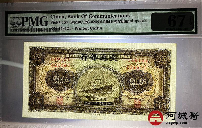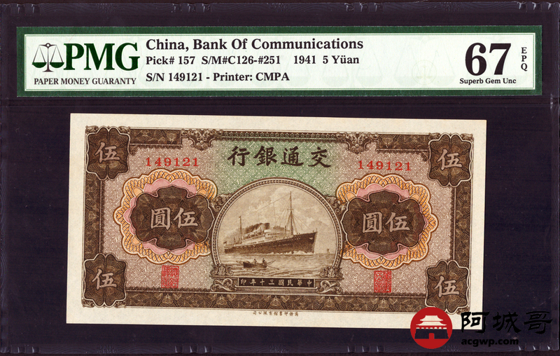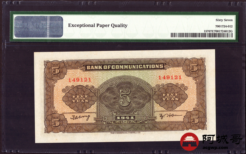 Lot:5 民国30年 伍圆 交通银行 PMG 67EPQ 亚军分