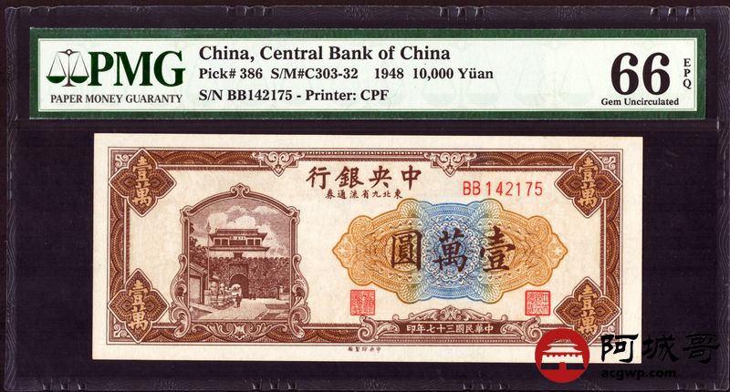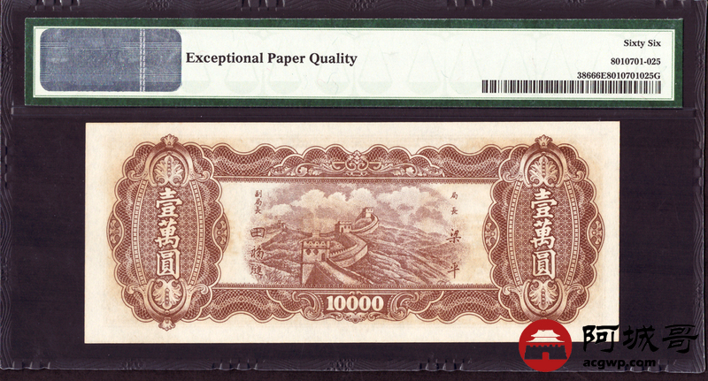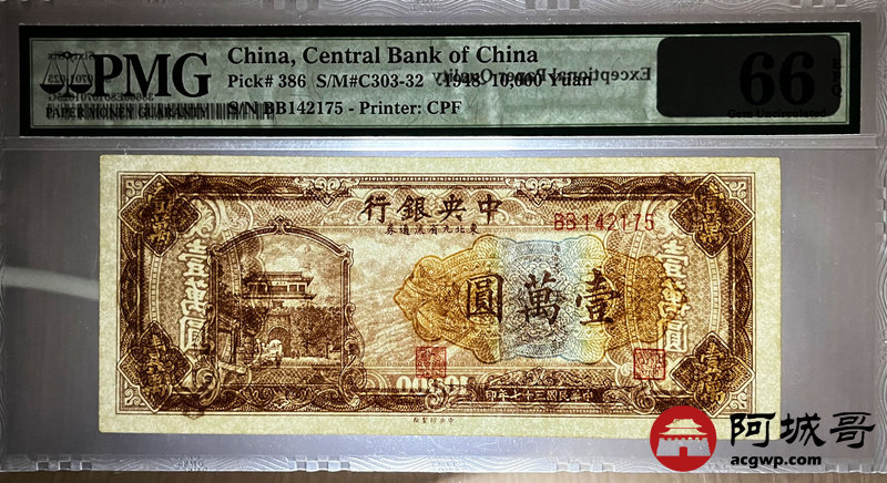 Lot:14 民国37年 壹萬圆 中央银行 PMG 66EPQ 亚军分