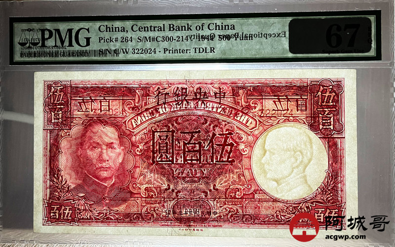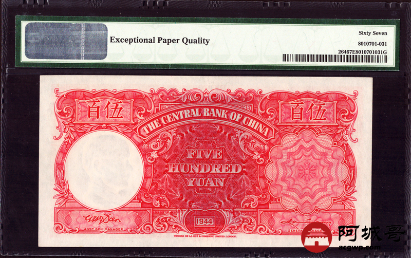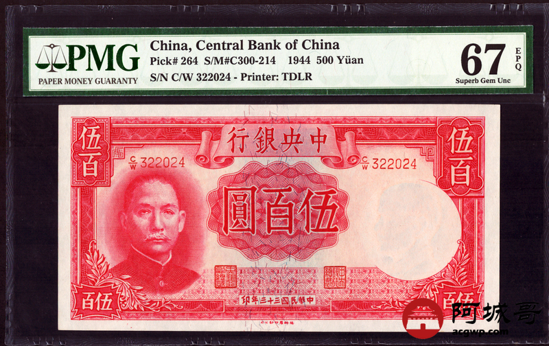Lot:4 民国33年 伍佰圆 中央银行 PMG 67EPQ 亚军分 高于此分仅1张
