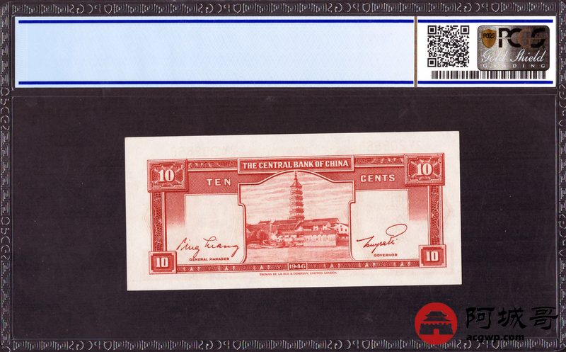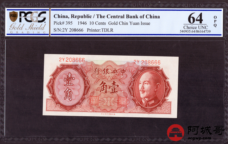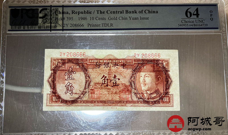 Lot:1 1946年 壹角 中央银行 PCGS 64OPQ 好号无47尾号豹子号666