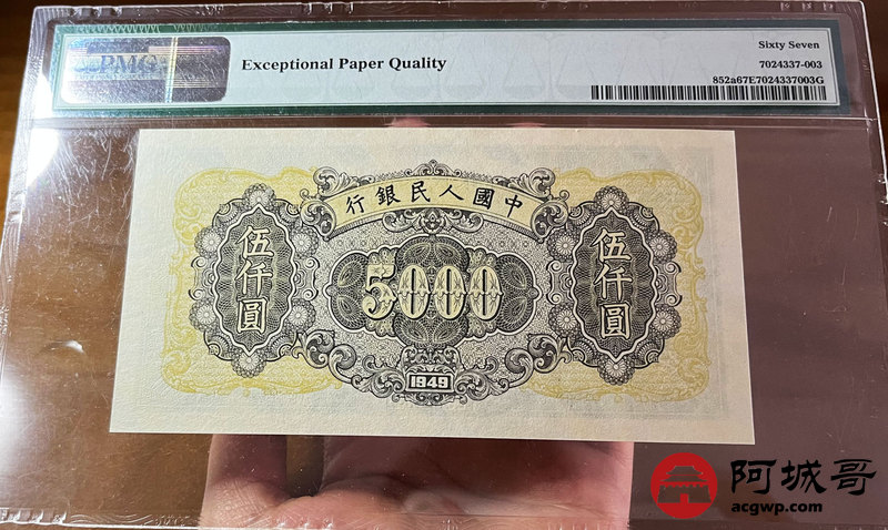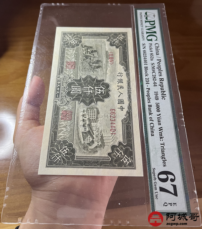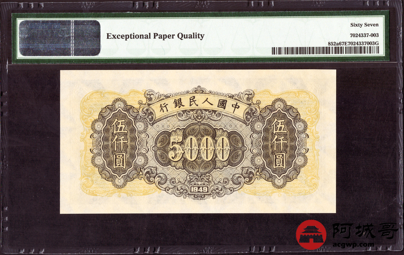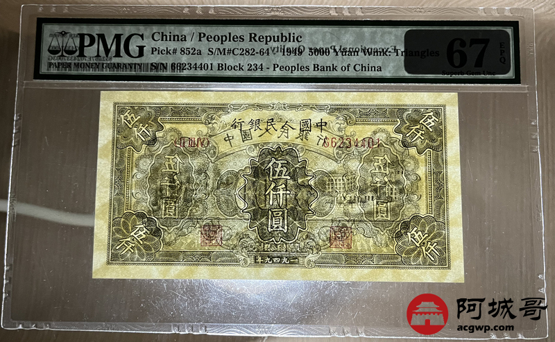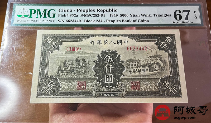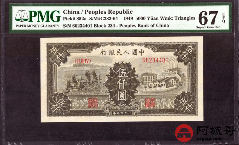 Lot:8 一版 1949年 伍仟圆拖拉机与工厂 PMG 67EPQ 冠军分 极为难得