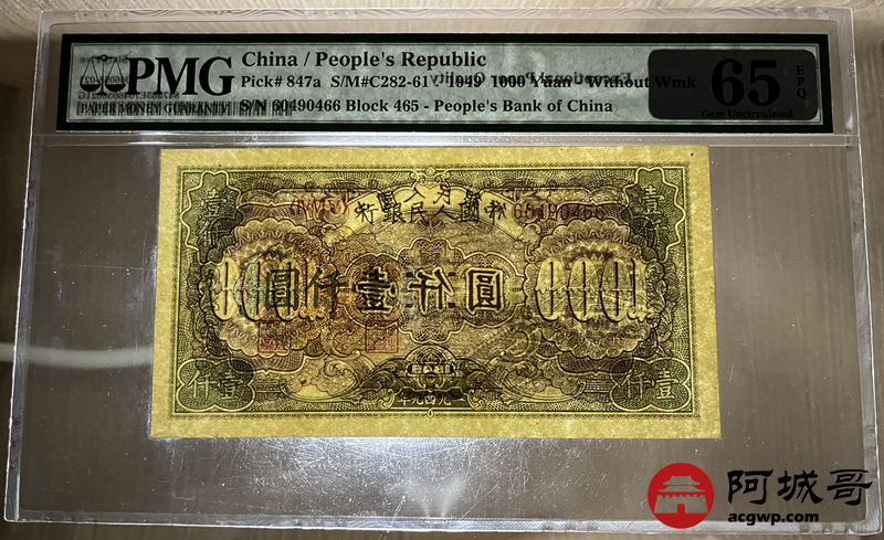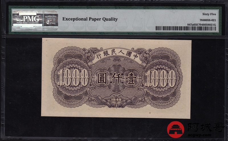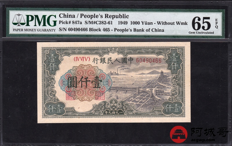 Lot:6 一版 1949年 壹仟圆钱塘江大桥 PMG 65 EPQ 无水印版 尾号66