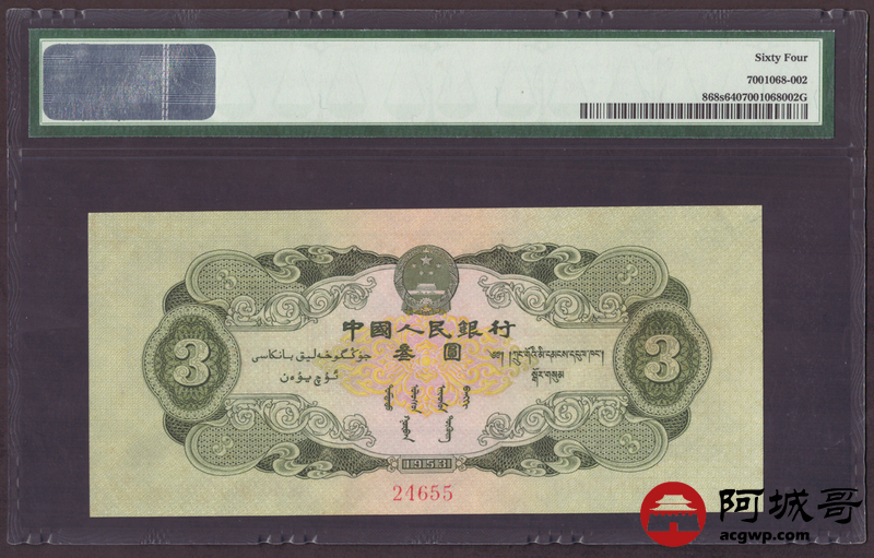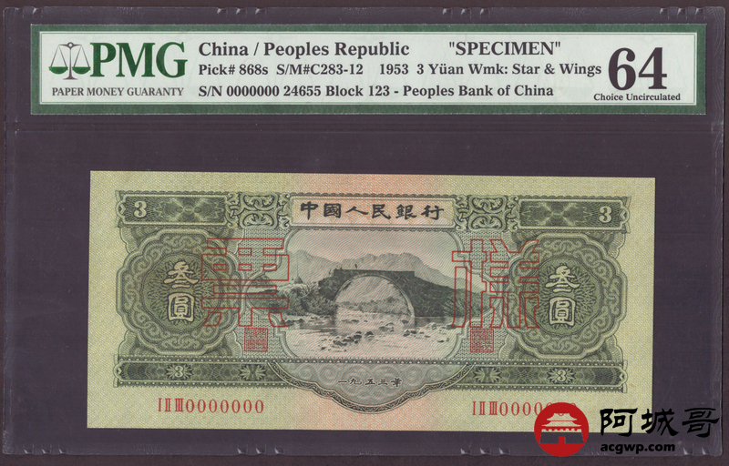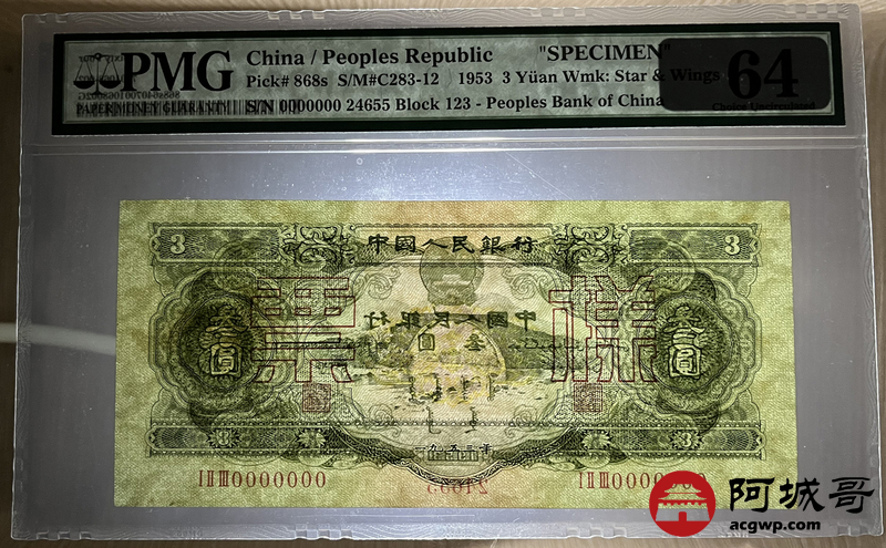 Lot:9 二版 1953年 绿叁圆 龙源井冈山叁圆 票样 PMG 64 高于此分仅33枚 是人民币史上唯一一枚叁圆面额票券 由周总理指定 由苏联代印 珍稀品种