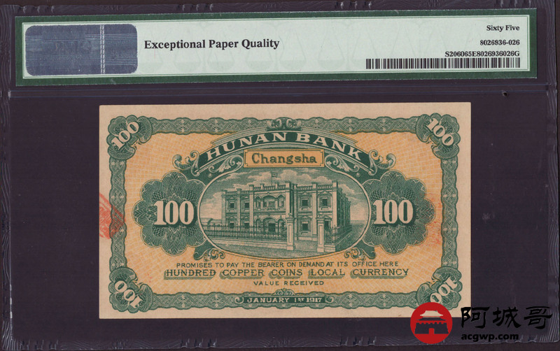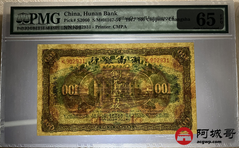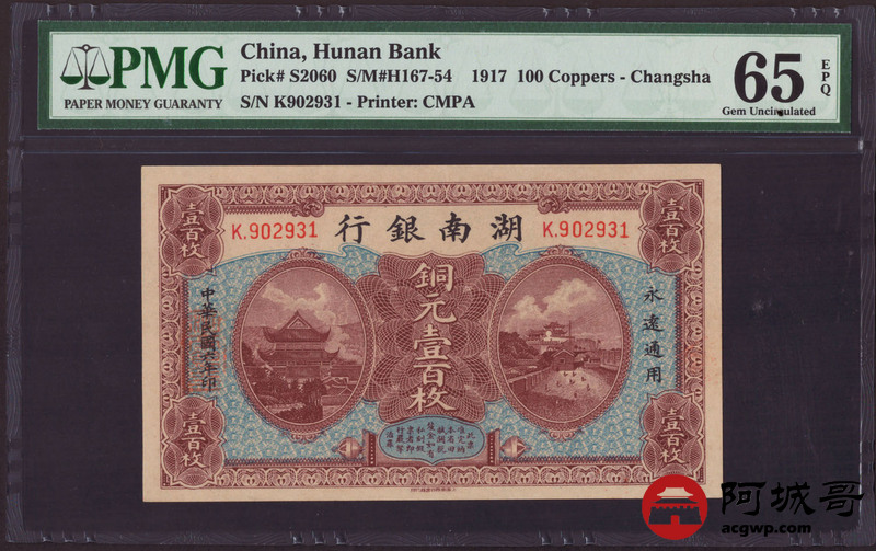 Lot:11 民国6年 湖南银行 铜元壹佰枚 PMG 65EPQ 冠军分