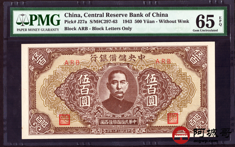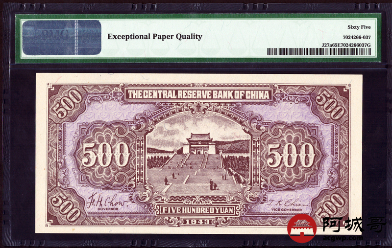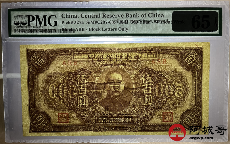 Lot:21 民国32年中央储备银行 伍佰圆 PMG 65EPQ