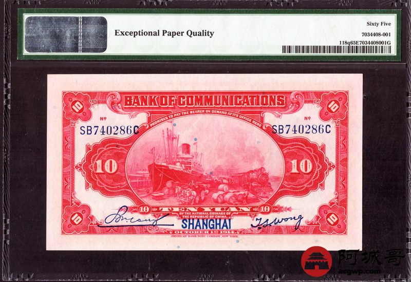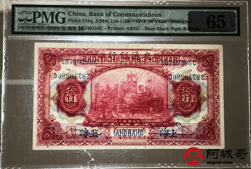 Lot:4 民国3年 交通银行 拾圆 上海地名 PMG 65EPQ