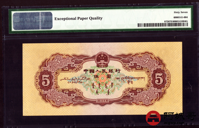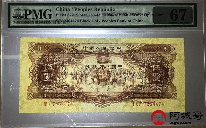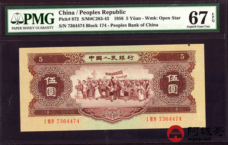 Lot:7 二版 1956年 黄伍圆 星水印 PMG 67EPQ