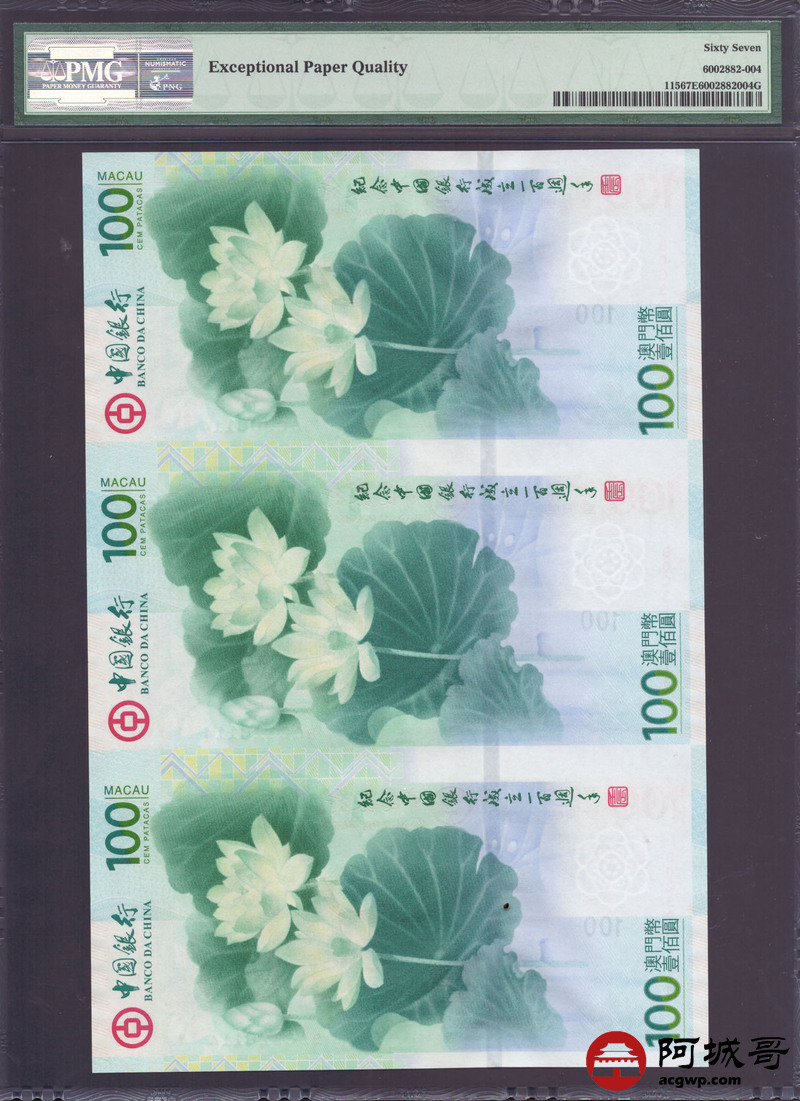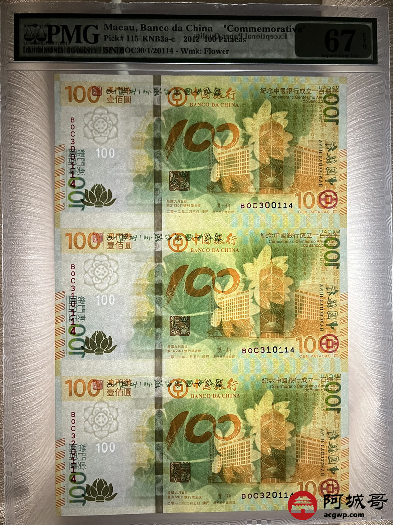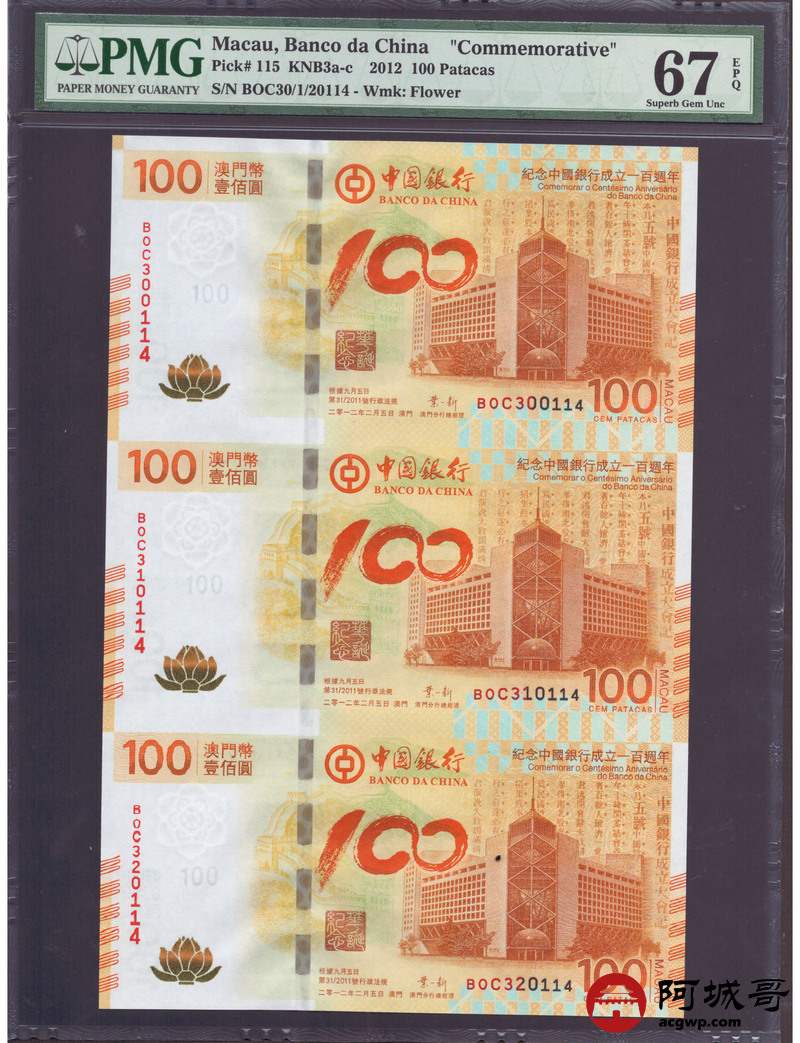 Lot:23 2012年 澳门壹佰圆 连体钞 PMG 67EPQ