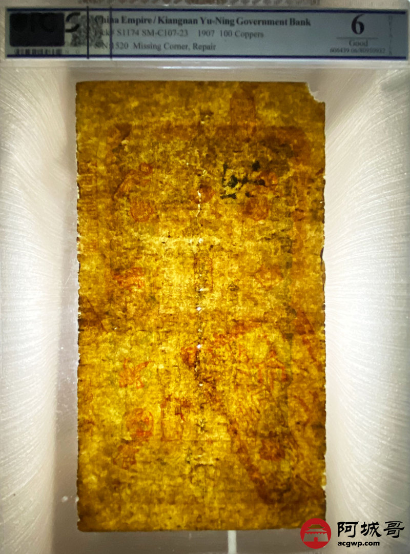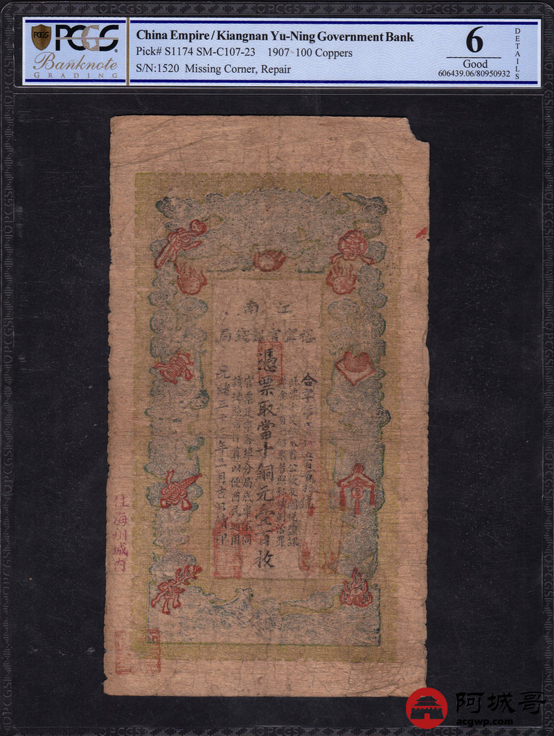 Lot:17 江南裕宁官银钱局 当十铜元壹佰枚 光绪33年 住海州城内 PCGS 6