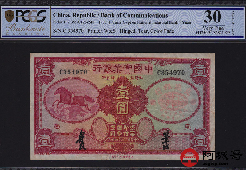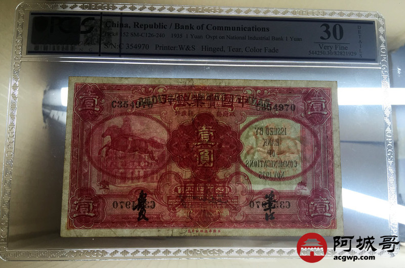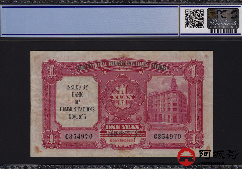 Lot:12 中国实业银行改交通银行 民国24年 上海地名 壹圆 好品少见 PCGS 30