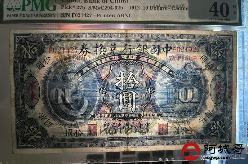 Lot:16 中国银行兑换券 民国元年 拾圆 广东地名 少见 值得收藏 PMG 40 有修