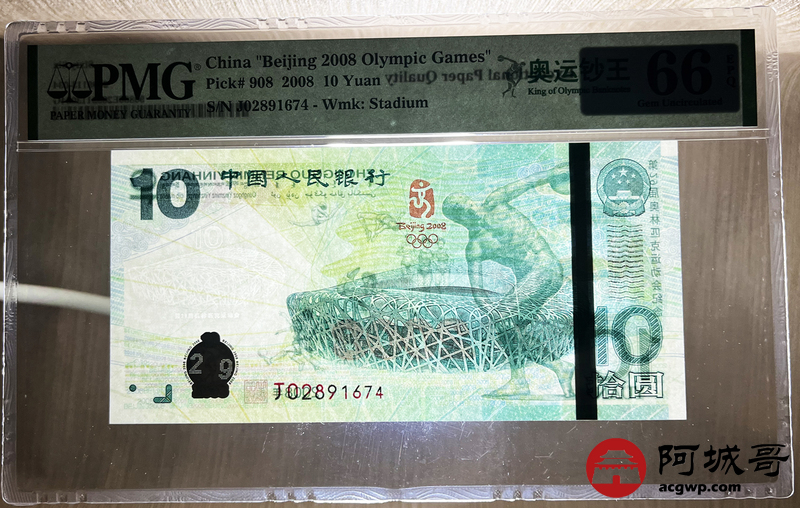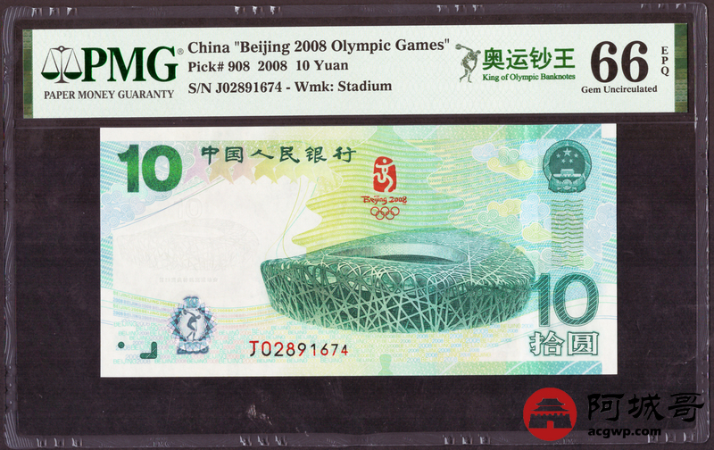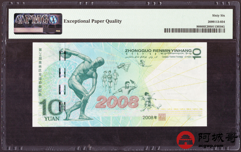 Lot:6 2008年 拾圆 奥运钞王 PMG 66EPQ