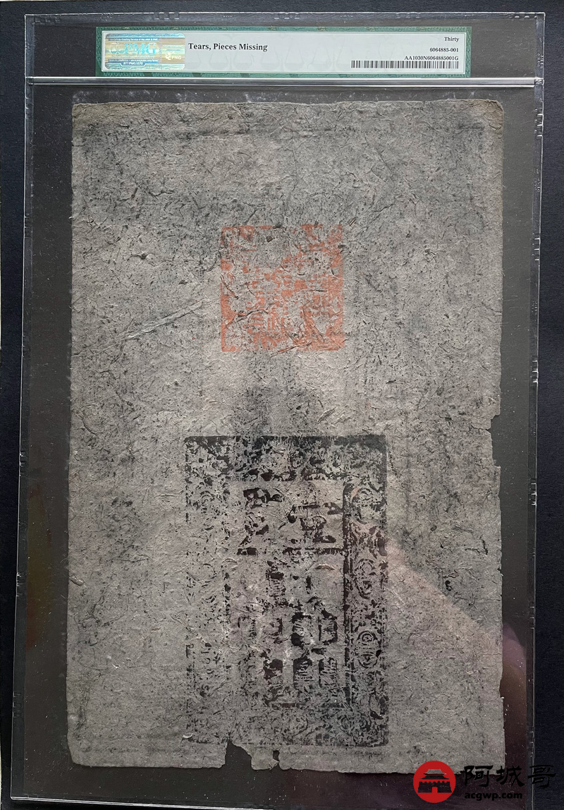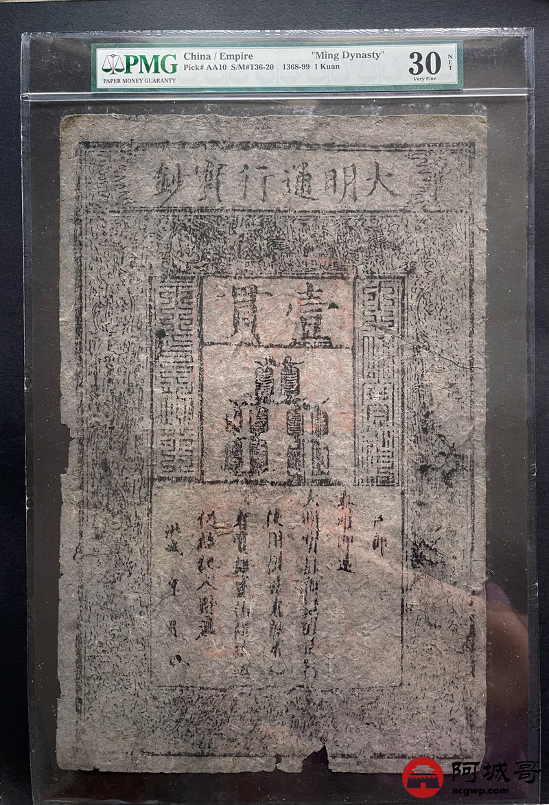 Lot:8 洪武年间大明通行宝钞壹贯PMG 30 少见
