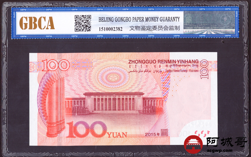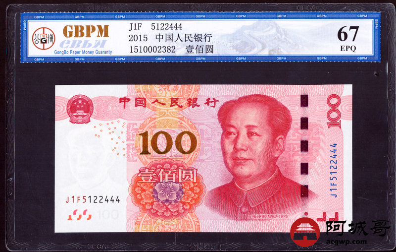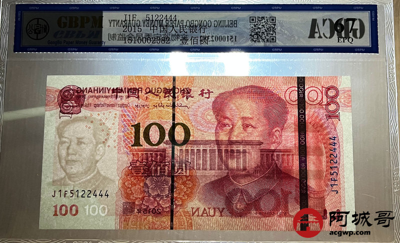Lot:18 一五年 中国人民银行 壹佰圆 公博67EPQ 尾豹子号444