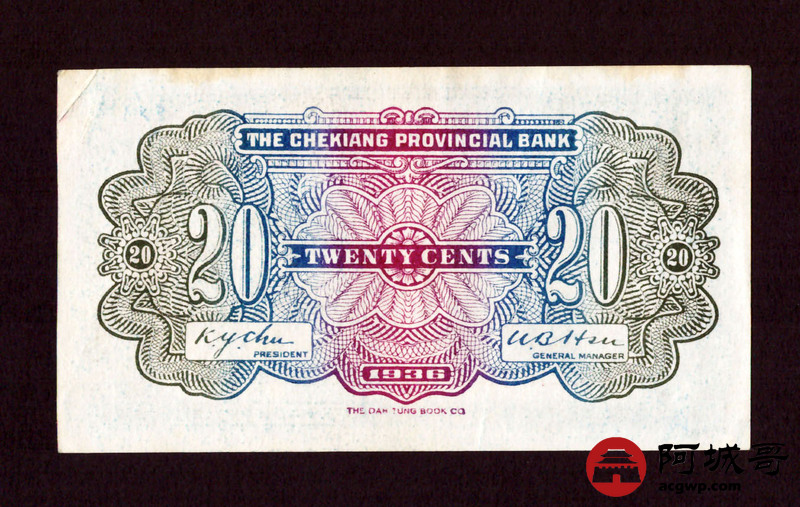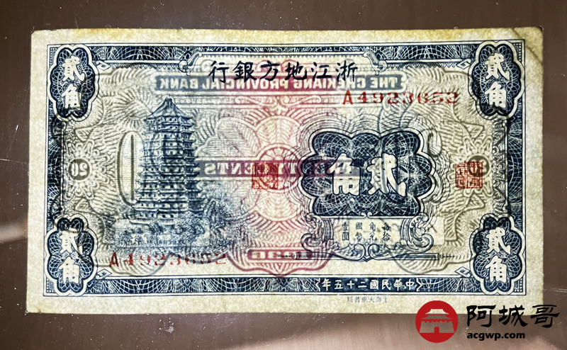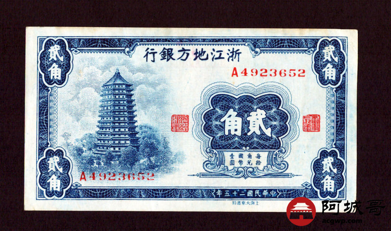 Lot:10 民国25年 浙江地方银行 贰角 88至9成新