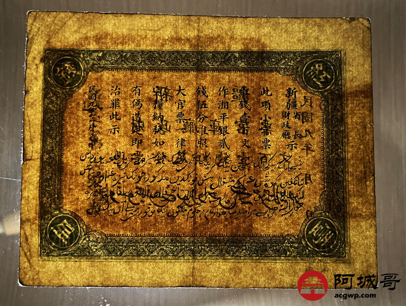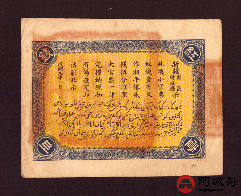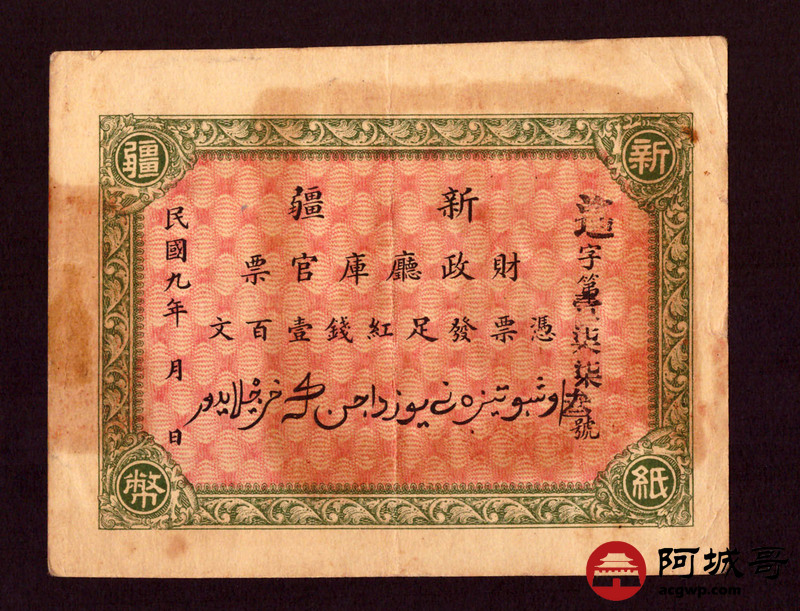 Lot:41 民国9年 新疆财政部库官票 红钱壹佰文 少见 原汁原味 85成新