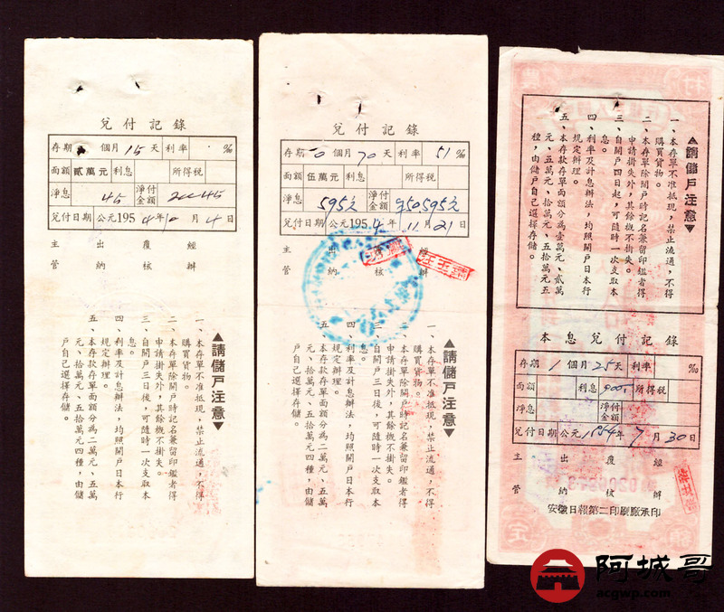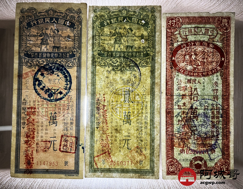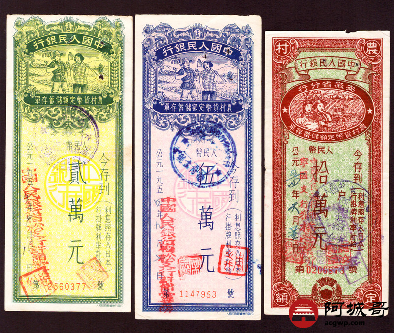Lot:50 1954 中国人民银行 农村货币定额储蓄单 贰萬圆、伍萬圆、拾萬圆 三张 8至85成新