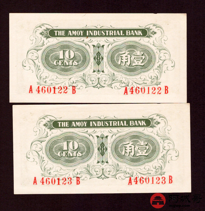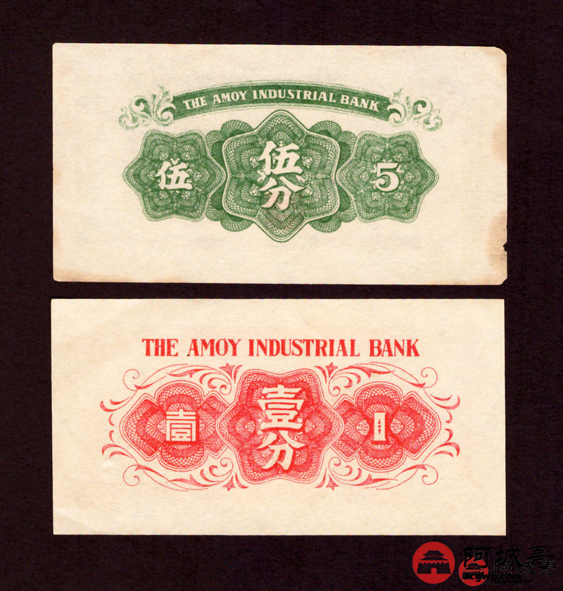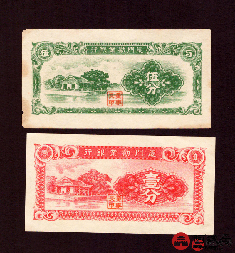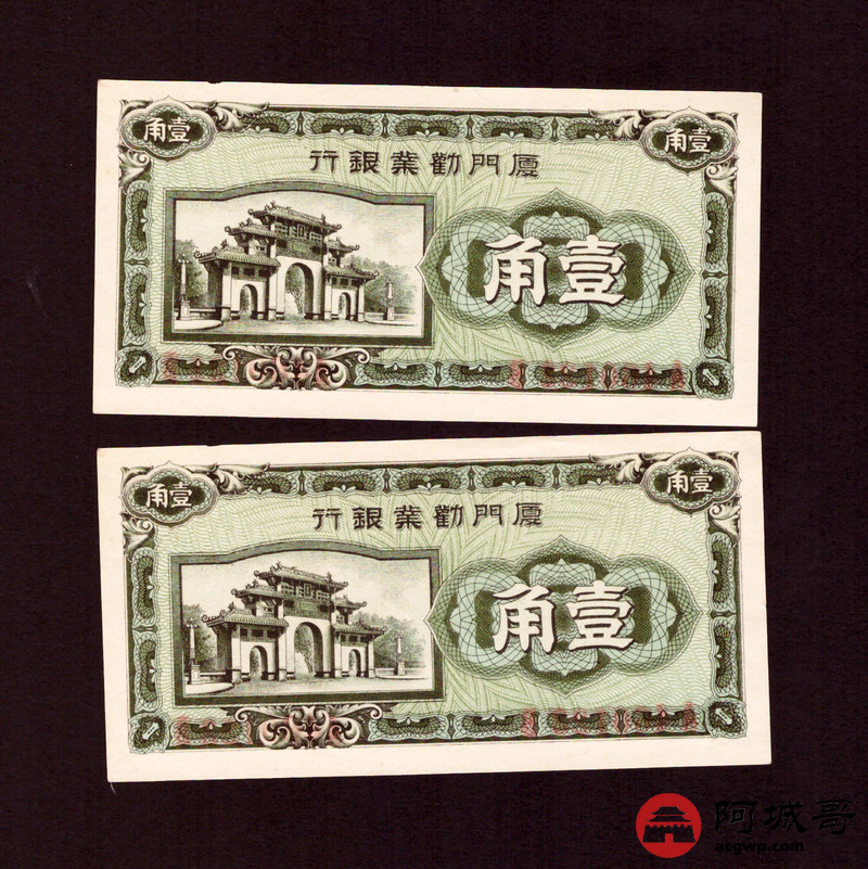 Lot:24 厦门劝业银行 壹角 两张连号 原票88成新;民国时期 厦门劝业银行 壹分、伍分 两张 88成新、7成新