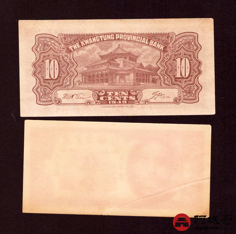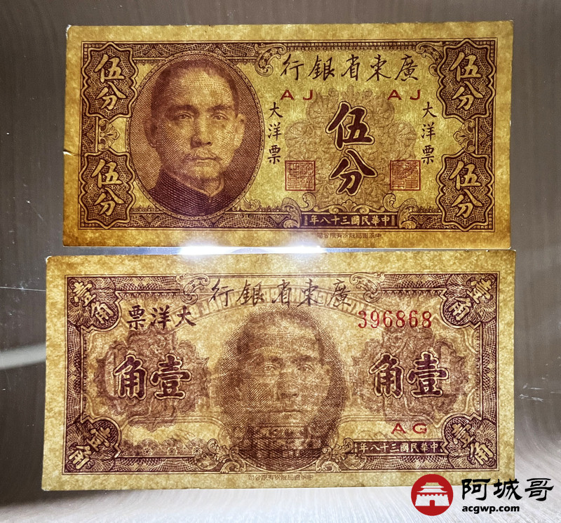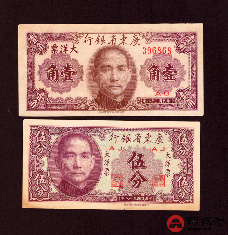 Lot:25 民国38年 广东省银行 大洋票壹角、伍分 两张 8成新