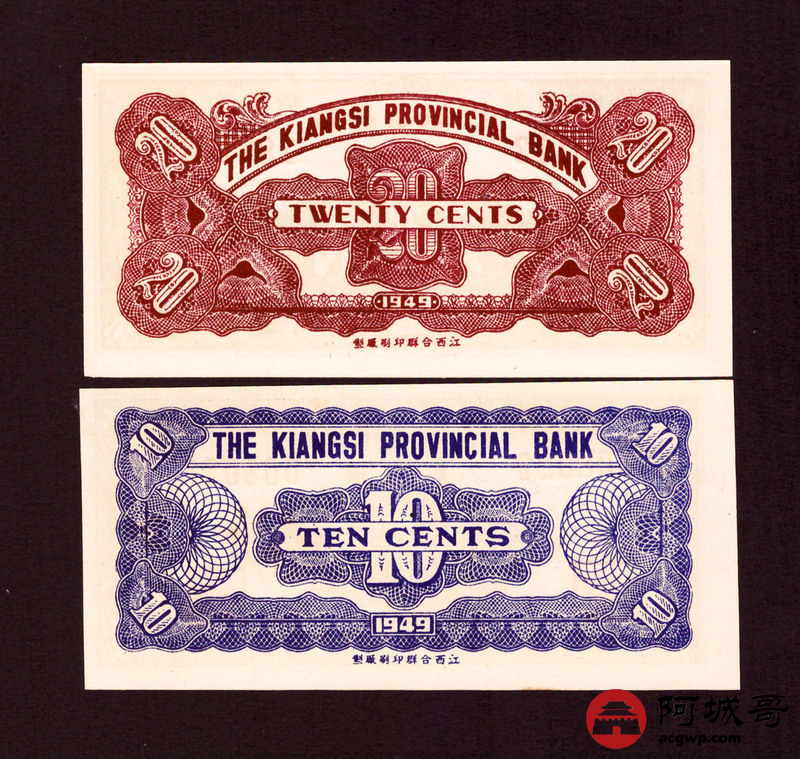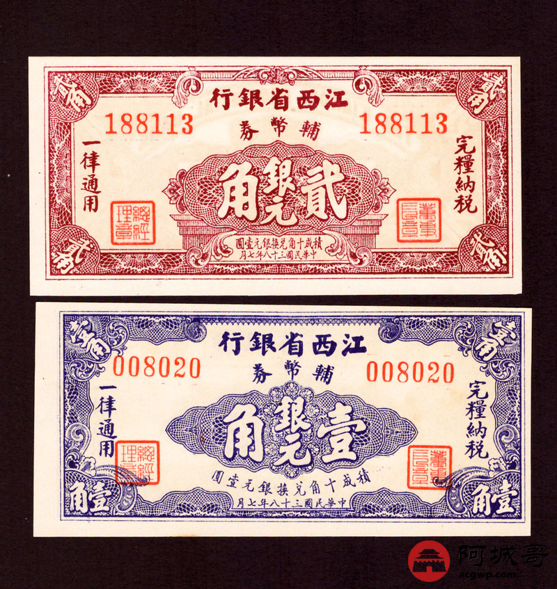 Lot:67 民国38年 江西省银行 辅币券贰角、壹角 两张 95至全新