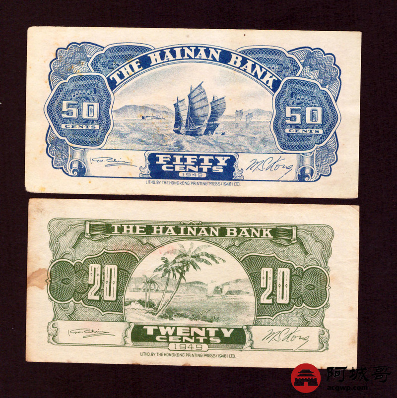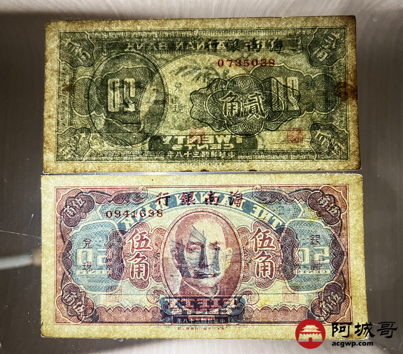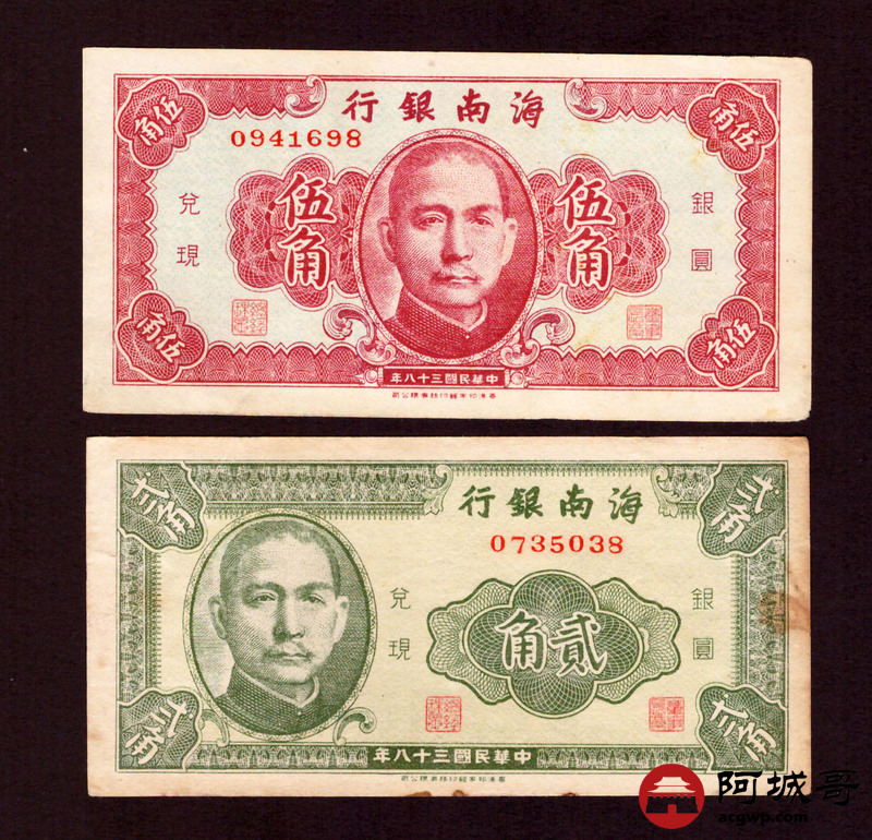 Lot:66 民国38年 海南银行 伍角、贰角 两张 88成新、78成新