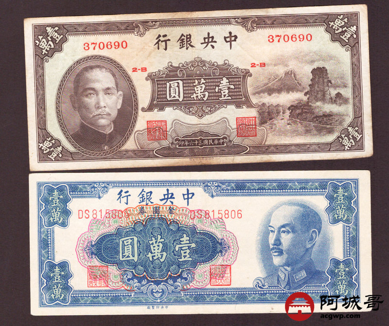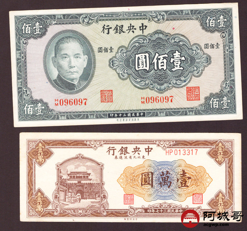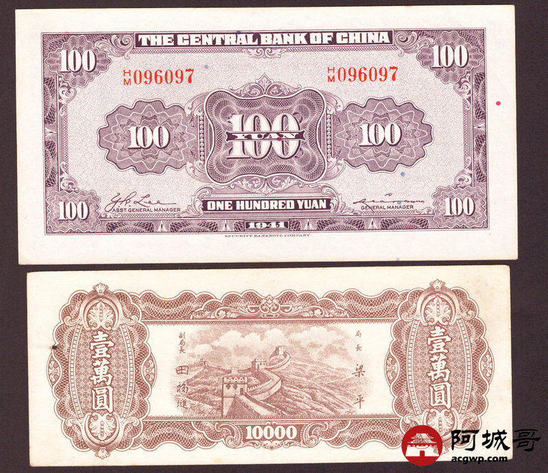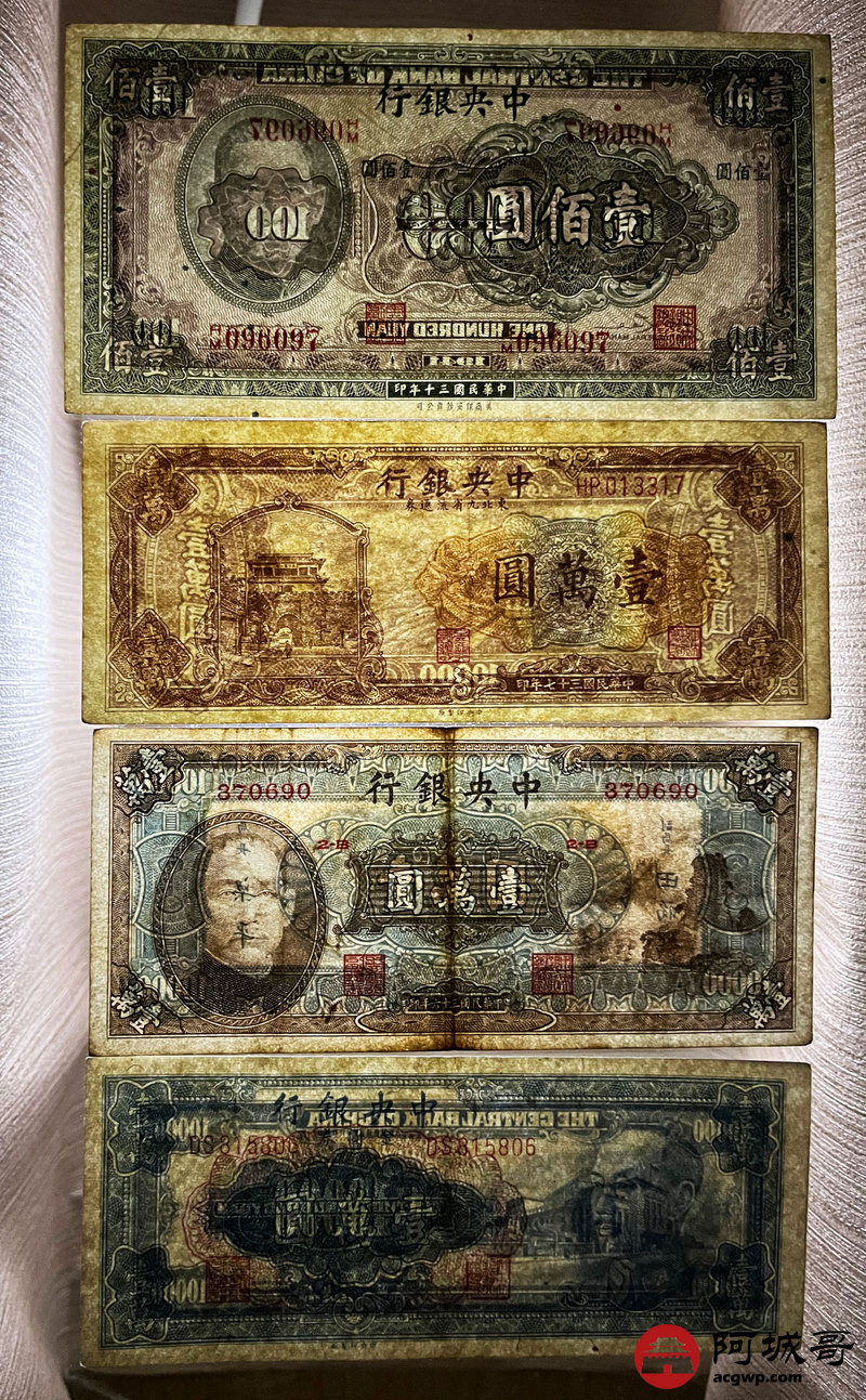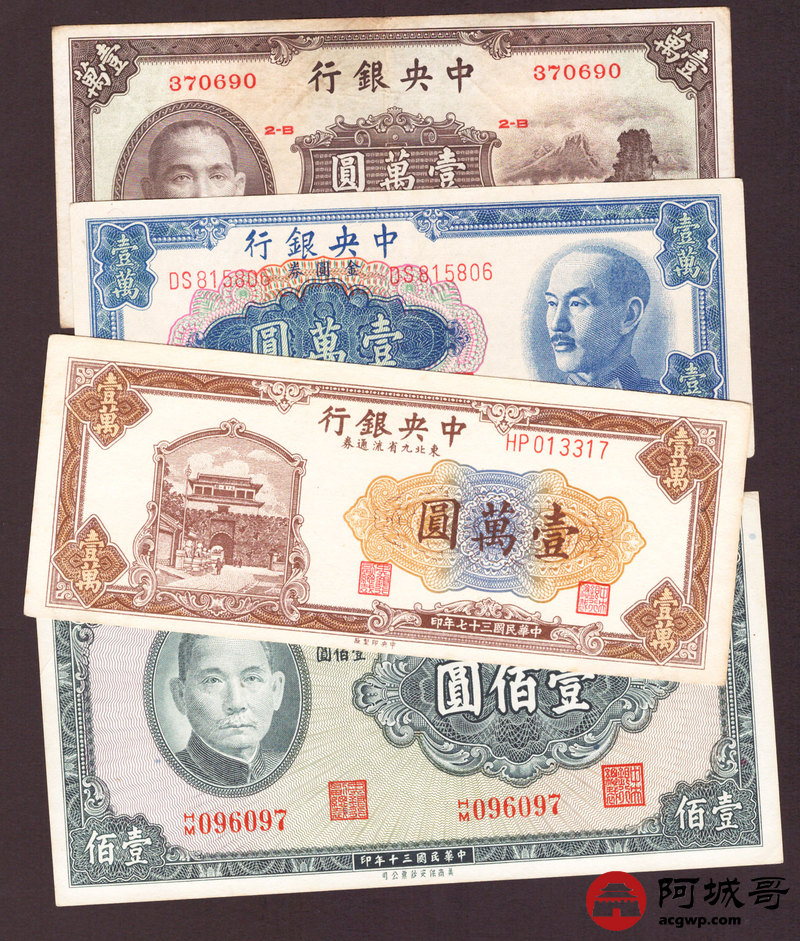 Lot:43 民国时期 中央银行 壹萬圆、壹佰圆 四张 从上至下78成新、8成新、88成新、9成新 大山水较少见