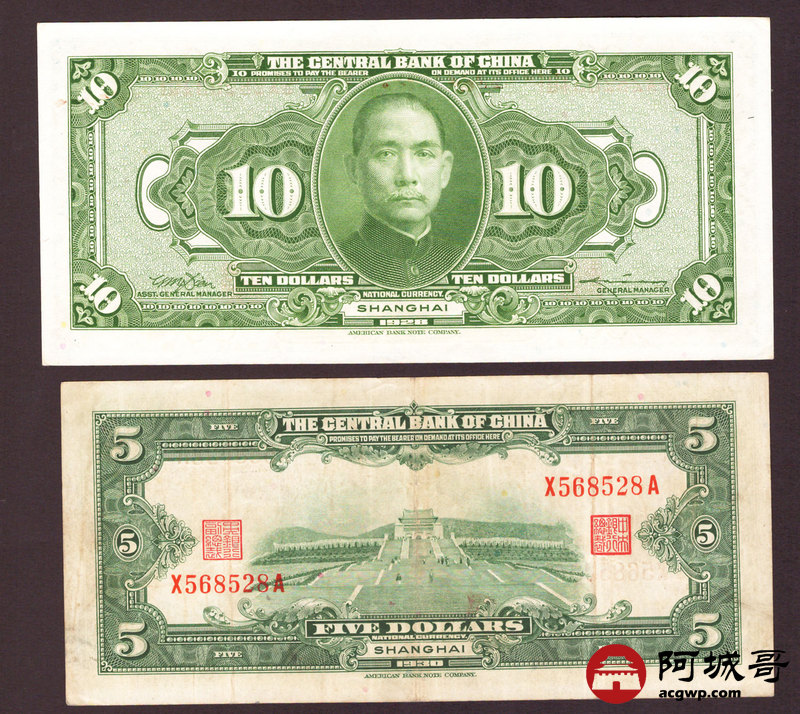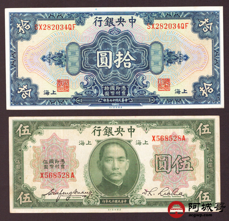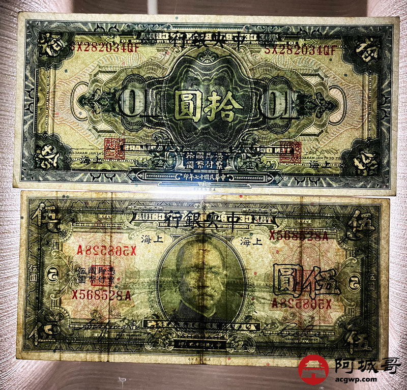 Lot:40 民国时期 中央银行 伍圆、拾圆 上海地名 两张 88成新、8成新