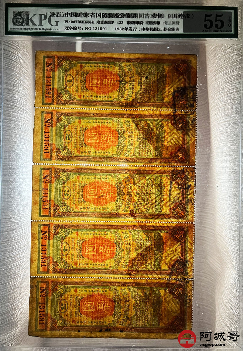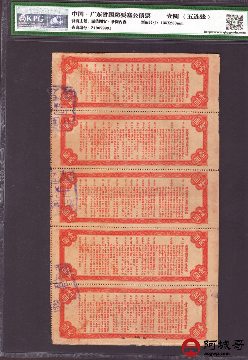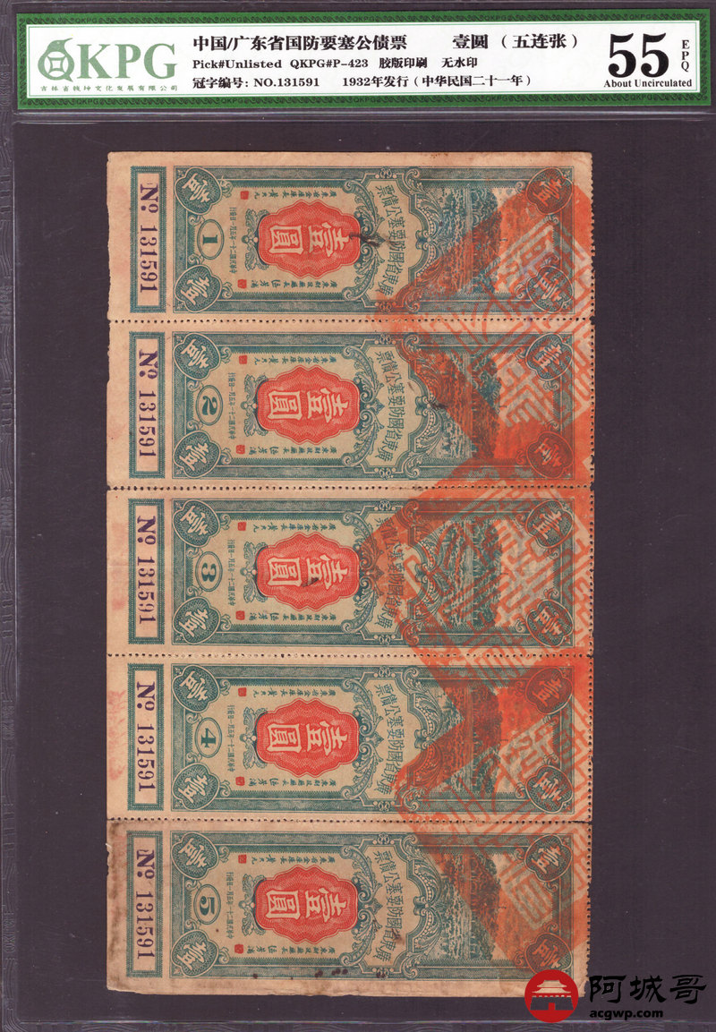 Lot:23 1932年 广东省国防要塞公债票 壹圆 无水印 五连张 KPG 55EPQ