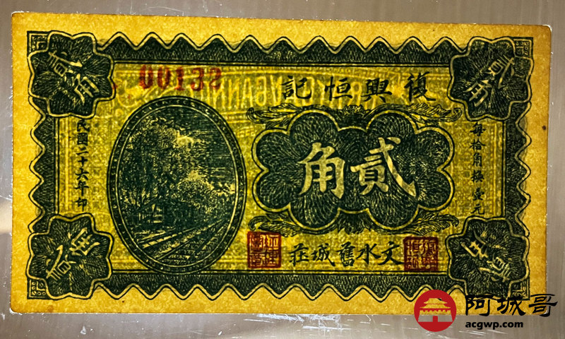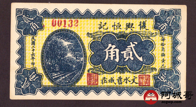 Lot:44 民国26年 复兴恒记 贰角 9成新