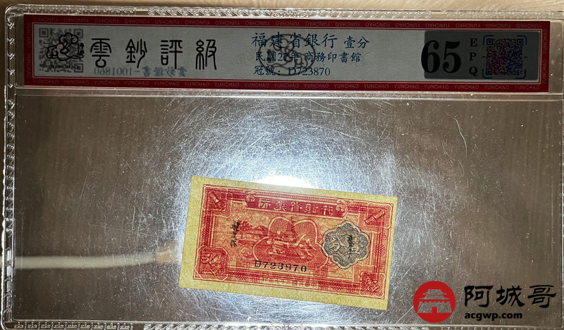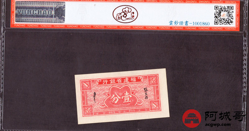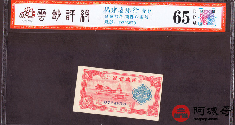 Lot:6 民国27年 福建省银行 壹分 雲钞评级 65EPQ