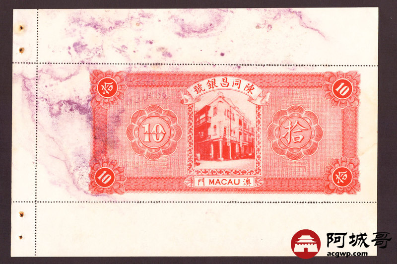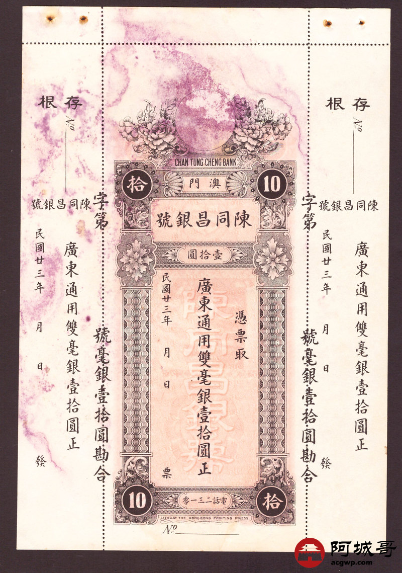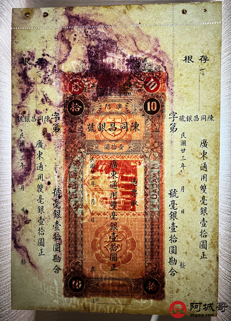 Lot:58 民国20年 澳门陈同昌银号 广东通用雙毫银壹拾圆 带存根 88至9成新